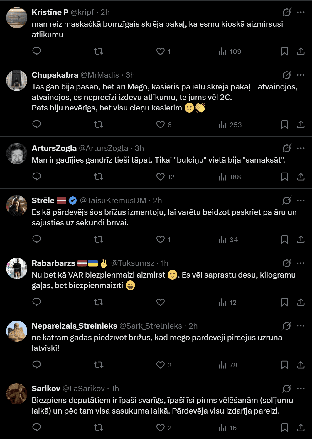 Kāda sieviete atceras gadījumu Maskačkā, kur bezpajumtnieks viņai skrējis pakaļ, lai atdotu kioskā aizmirsto atlikumu. Arī citi atzīst – godprātība joprojām pastāv. Kāds vīrietis stāsta, ka reiz “Mego” kasieris pat izskrējis uz ielas, lai atdotu nepareizi izdotus divus eiro. “Pats biju nevērīgs, bet visu cieņu kasierim,” viņš raksta.