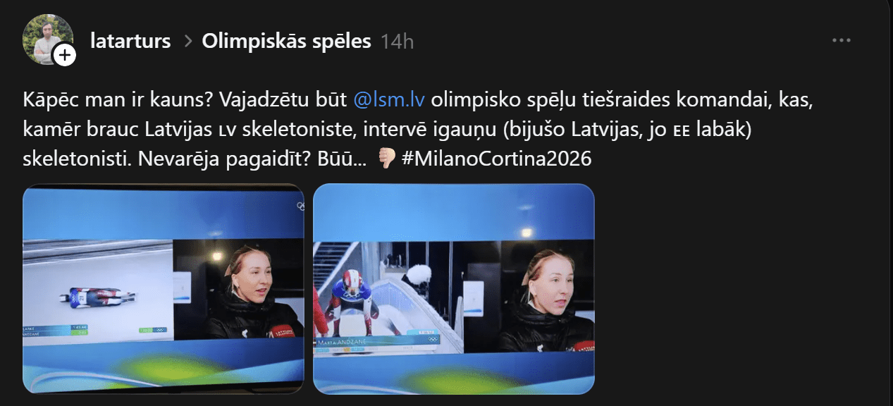“Kāpēc man ir kauns? Vajadzētu būt @lsm.lv olimpisko spēļu tiešraides komandai, kas, kamēr brauc Latvijas skeletoniste, intervē igauņu (bijušo Latvijas, jo Igaunijā labāk) skeletonisti. Nevarēja pagaidīt? Būū… #MilanoCortina2026,” vietnē “Threads” raksta Artūrs.