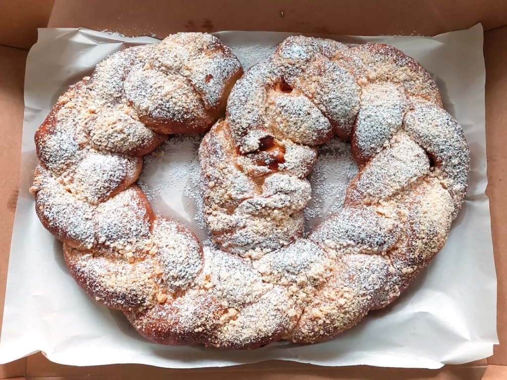 Katru mīklas joslu no vienas garās malas sarullē veltnī, vienlaikus to stiepjot un savirpinot kā auklu, līdz ir 60 cm garumā.