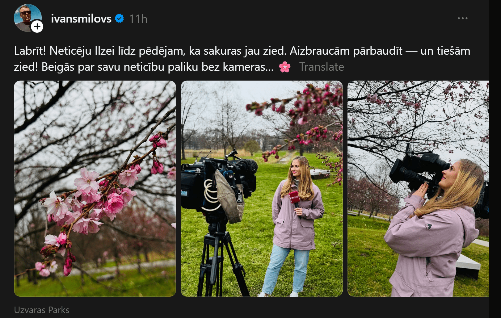 “Labrīt! Neticēju Ilzei līdz pēdējam, ka sakuras jau zied. Aizbraucām pārbaudīt — un tiešām zied! Beigās par savu neticību paliku bez kameras…” vietnē “Threads” līdzcilvēkiem vēsta LTV Ziņu dienesta vadošais operators Ivans Milovs.
