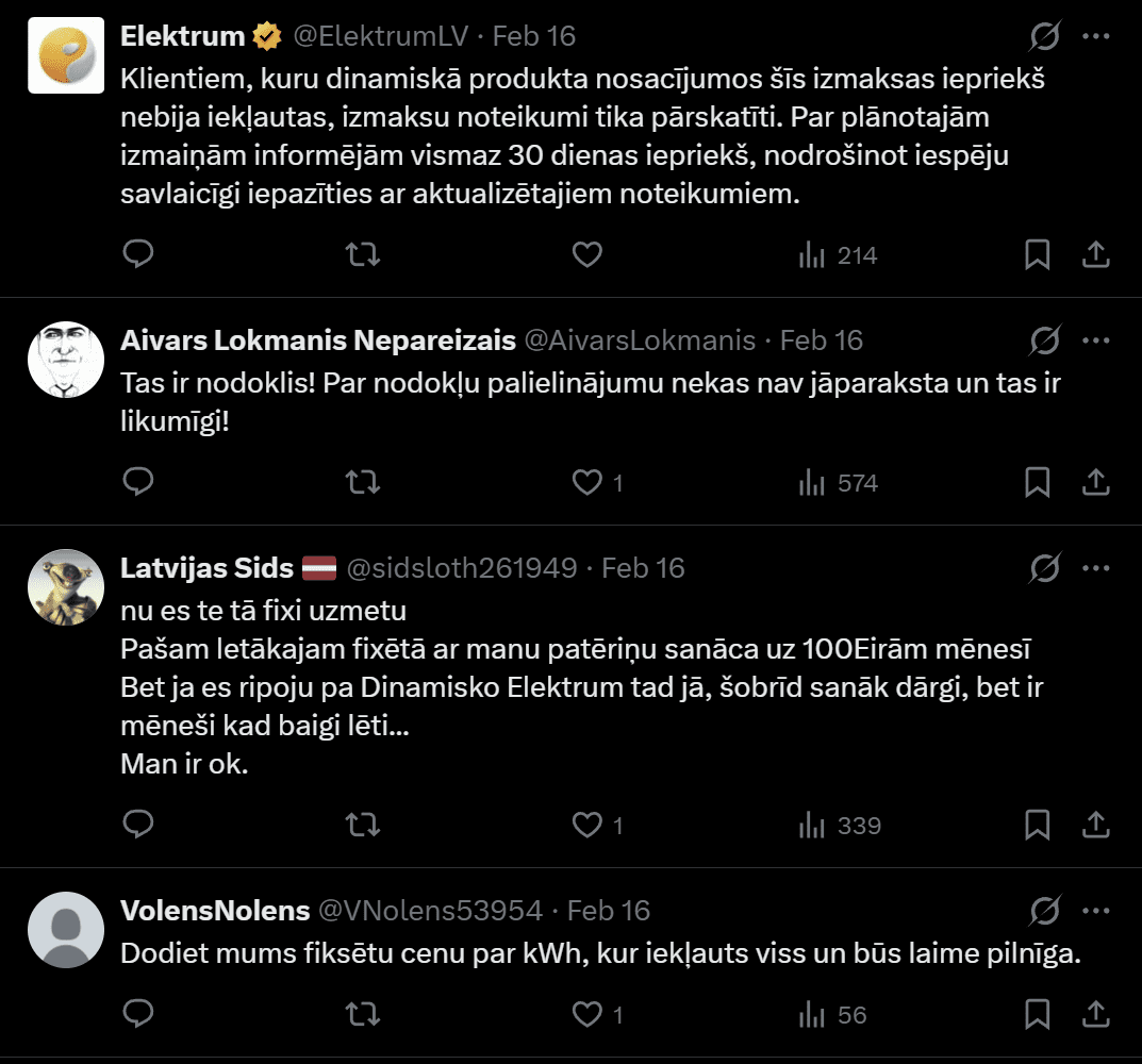 “Elektroenerģijas pārdošanas nodrošināšanā pastāv gan fiksētās, gan mainīgās izmaksas un pēc šāda principa ir veidots arī “Elektrum Dinamiskais” (jeb biržas cenas) produkts. Papildus pēc Baltijas valstu pievienošanās Eiropas energosistēmai 2025. gada februārī elektroenerģijas tirgotāji sedz arī iepriekš nebijušas izmaksas par balansēšanu elektrotīkla frekvences stabilitātes nodrošināšanai. Līdz ar to kopējo rēķinu klientam veido vairākas komponentes, kur katra sedz atšķirīgu izmaksu veidu – gan fiksētas izmaksas, kas jāsedz neatkarīgi no klienta patērētā elektrības daudzuma, gan mainīgas izmaksas, kas rodas tieši no patērēto kWh daudzuma,” paskaidro uzņēmuma pārstāve.