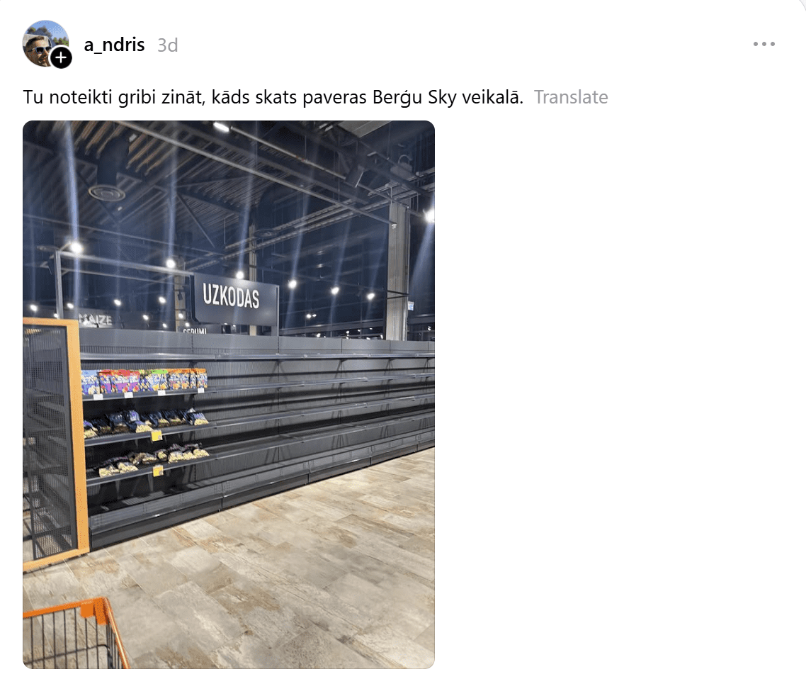 Piemēram, Andris raksta: “Tu noteikti gribi zināt, kāds skats paveras Berģu “Sky” veikalā.” Šim ierakstam viņš klāt pievienojis fotoattēlu, kurā redzams, ka uzkodu plauktā palikuši vien pāris produkti.