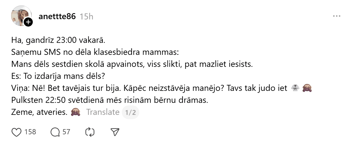 Kāda mamma sociālajā tīklā “Threads” dalījusies ar situāciju, kuru piedzīvojusi. Saņemot īsziņu no sava dēla klasesbiedra mammas, viņa uzzinājusi, ka kāds skolēns skolā esot apvainots un pat nedaudz iekaustīts. Tomēr pārmetums netika vērsts pret bērnu vai tā vecākiem, kurš to, iespējams, izdarījis, bet gan pret viņas dēlu, par to, ka viņš nav aizstāvējis klasesbiedru, lai gan apmeklē džudo nodarbības.