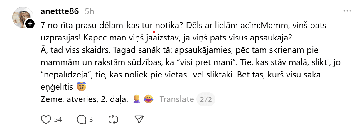 “Manējais atkal kā aktīvākais vienmēr tiek pataisīts par vainīgo. Pat neiedziļinoties situācijā. Un būtu smieklīgi, ja nebūtu skumji, kad es kā mamma noskaidroju patiesību un ne vienmēr mans vainīgs… Un, jā, ir vainots arī tad, kad nebija klāt…”