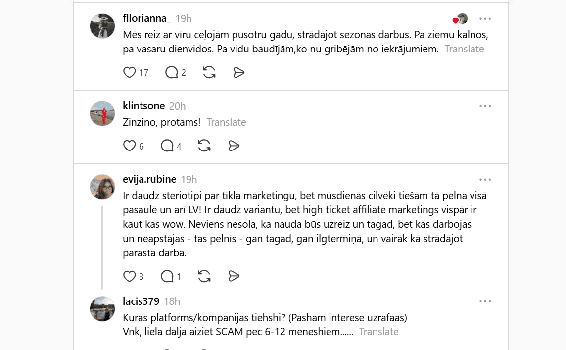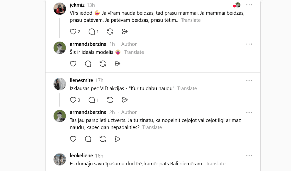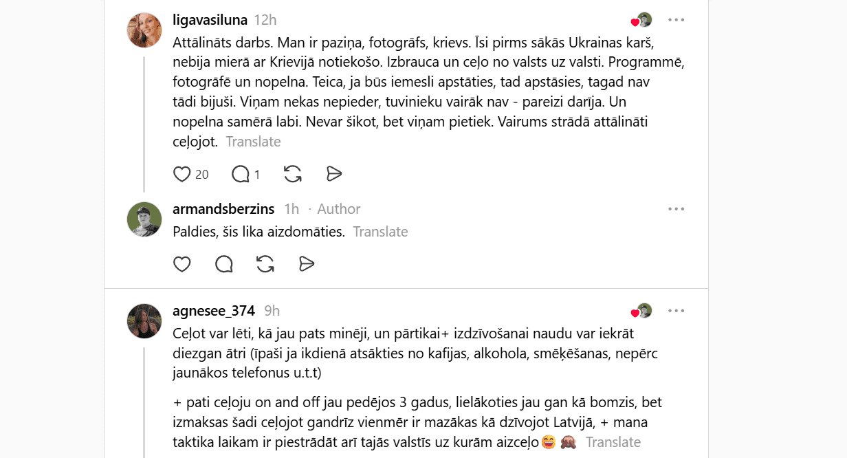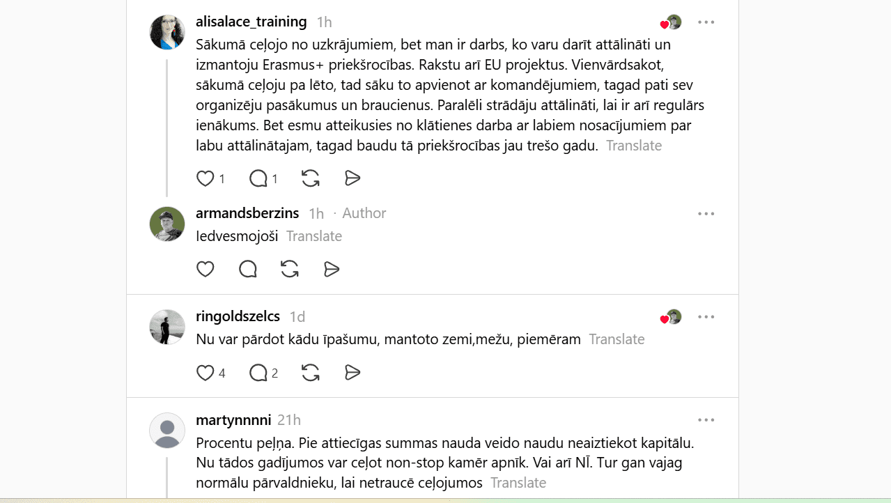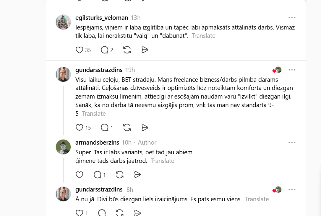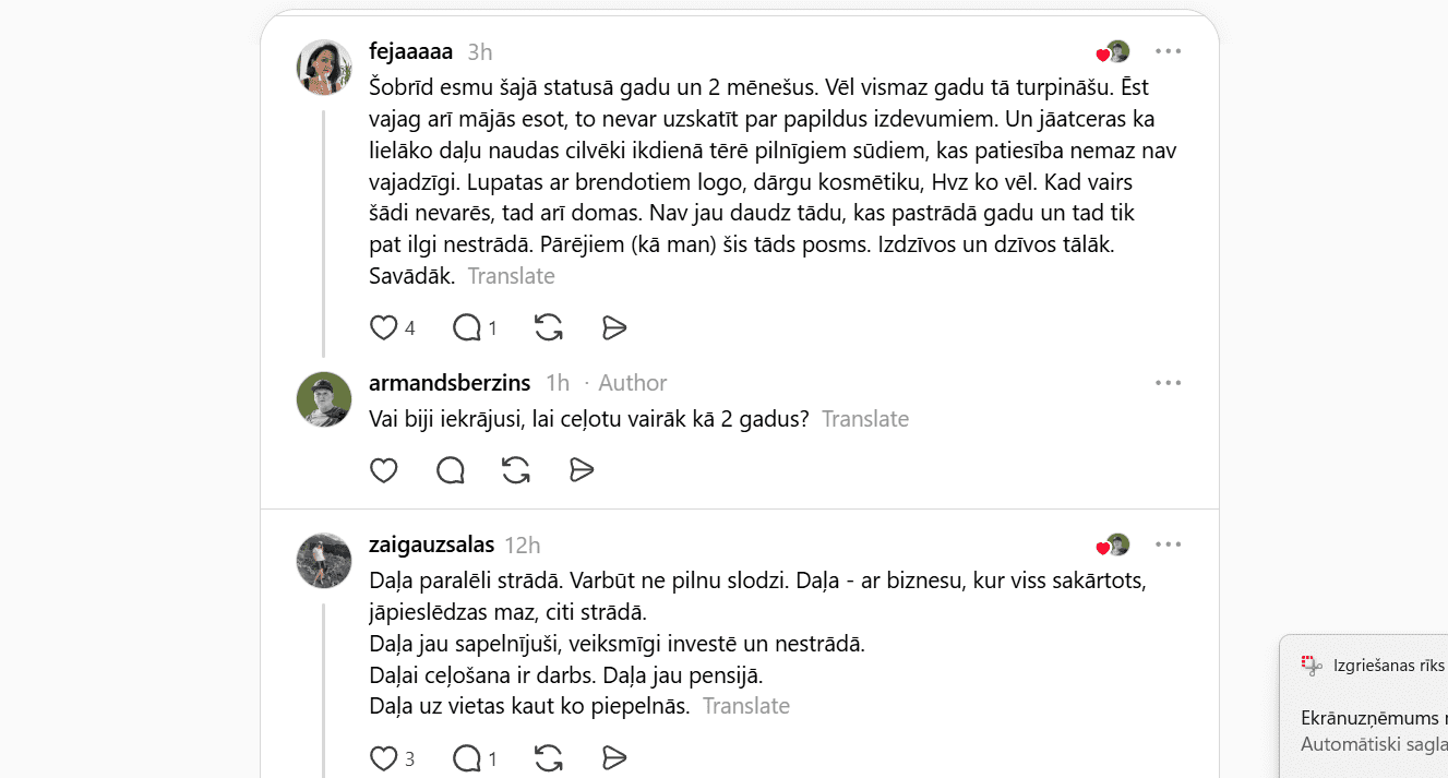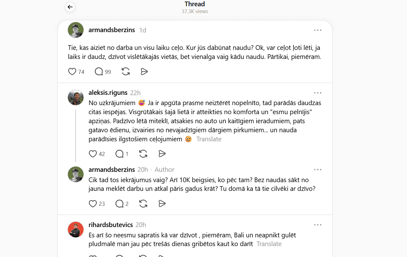 To spilgti atspoguļo arī sociālo tīklu diskusijas. Piemēram, platformā Threads nesen izcēlusies plaša diskusija, kas īsti dzīvē ir jādara, lai varētu ceļot un vienlaikus nestrādāt no algas līdz algai? Cilvēki dalās ar pieredzi, idejām un arī vilšanos, meklējot veidus, kā saglabāt dzīves kvalitāti laikā, kad viss kļūst dārgāks.