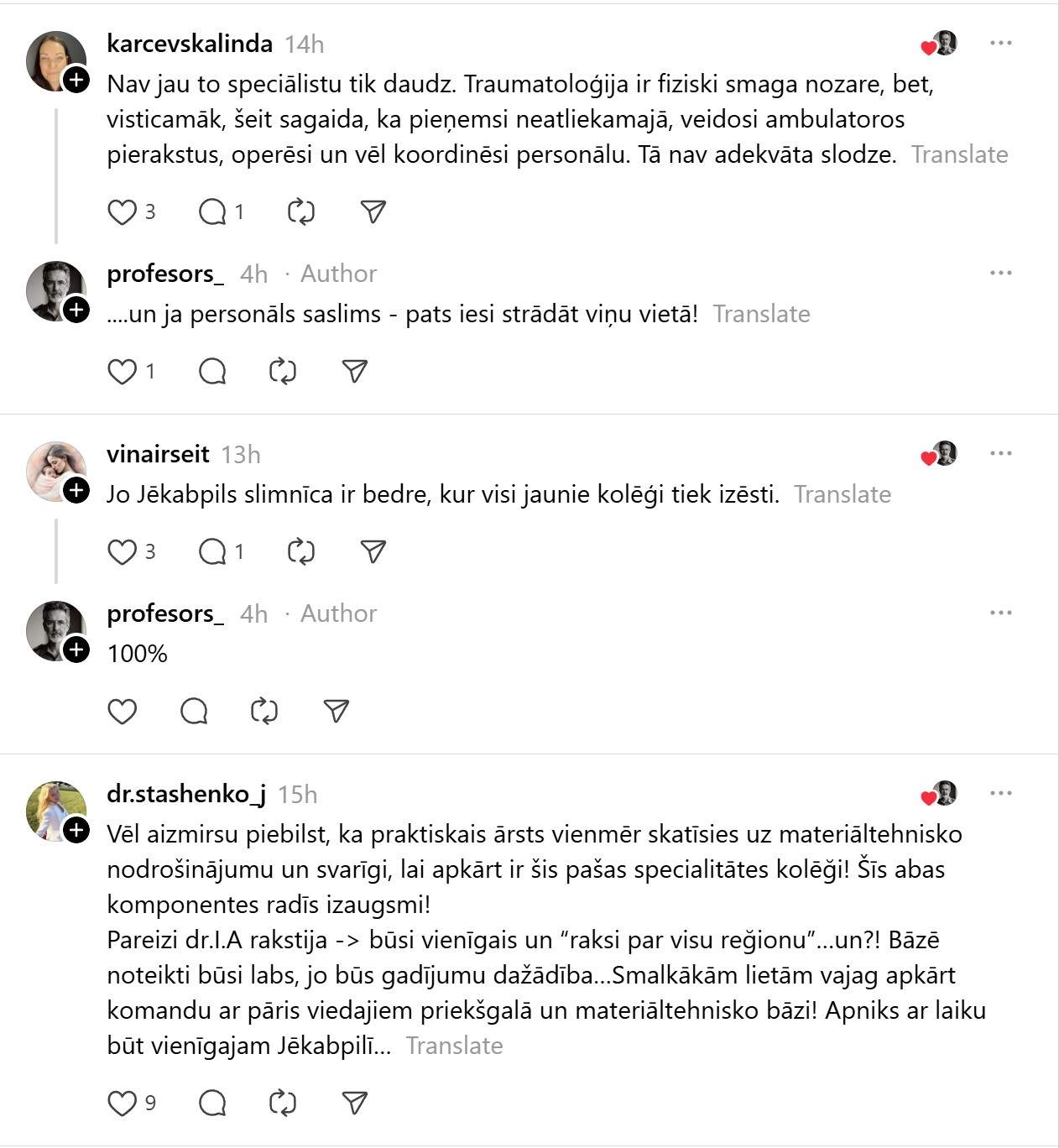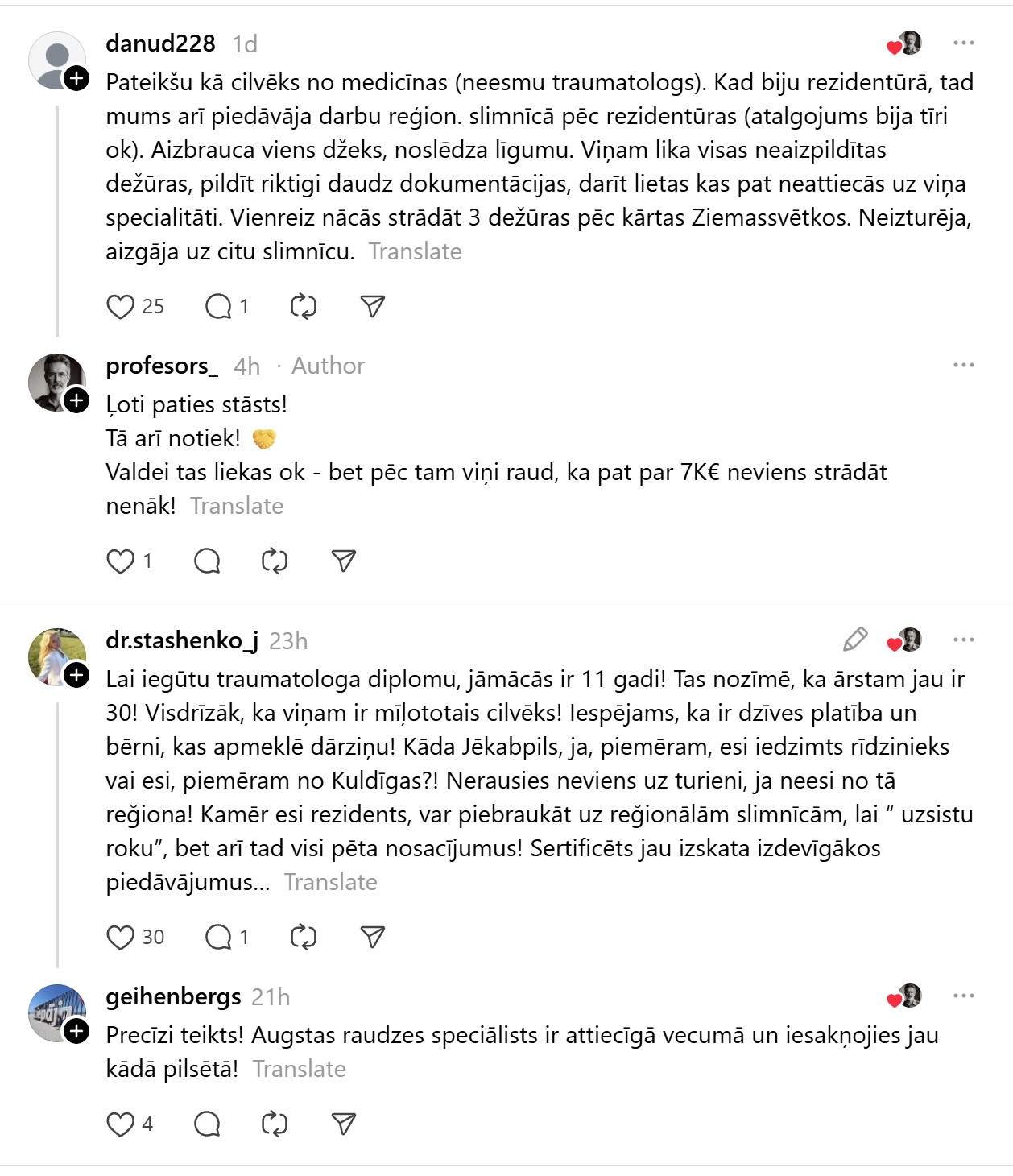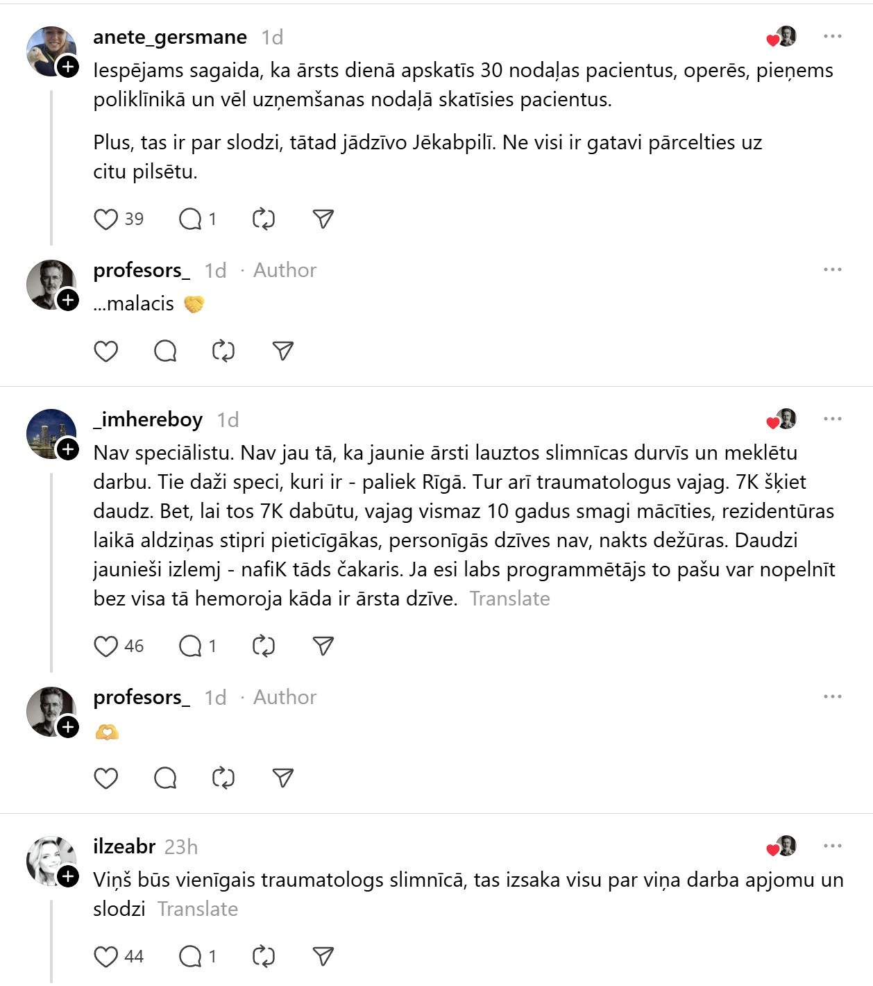 Diskusijas par šo tēmu notiek arī soctīklā “Threads”, tās aizsācis kāds lietotājs ar rosinājumu: “7 000 par slodzi + piemaksas. Uzraksti komentāru, kāpēc par šādu atalgojumu “nopietnu pretendentu joprojām nav”!”