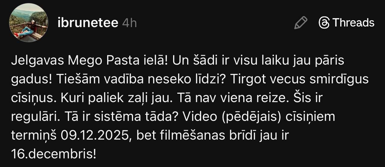 “Jelgavas “Mego” Pasta ielā! Un šādi ir visu laiku, jau pāris gadus! Tiešām vadība neseko līdzi? Tirgot vecus, smirdīgus cīsiņus, kuri paliek zaļi jau. Tā nav viena reize. Šis ir regulāri. Tā ir sistēma tāda? Video (pēdējais) – cīsiņiem termiņš 09.12.2025., bet filmēšanas brīdī jau ir 16. decembris,” sociālajā tīklā “Threads” neapmierinātību izsaka Ilona.