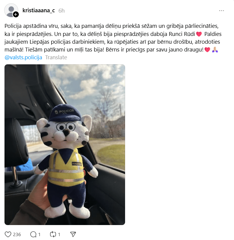 Mamma savā ierakstā īpaši uzsver policistu attieksmi, pateicoties viņiem par rūpēm un sirsnību: “Tiešām patīkami un mīļi tas bija! Bērns ir priecīgs par savu jauno draugu.”