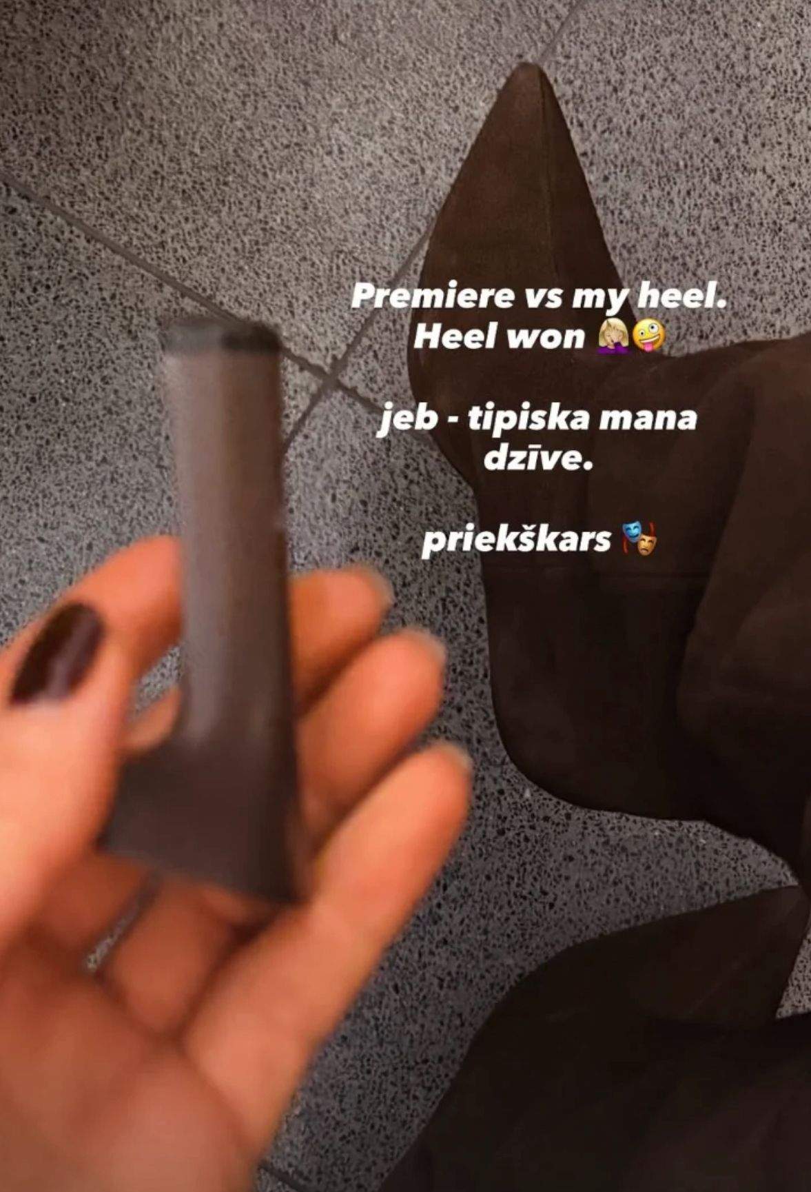 Viņas “Instagram” stāstā lasāms: “Pirmizrāde un mans papēdis. Papēdis uzvarēja. Jeb – tipiska mana dzīve. Priekškars.”