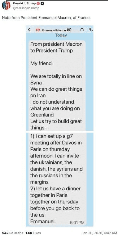 “Mans draugs, mēs esam pilnībā vienisprātis par Sīriju. Mēs varam paveikt lielas lietas Irānas jautājumā. Es nesaprotu, ko jūs darāt Grenlandes jautājumā. Mēģināsim panākt lielas lietas. Es varu noorganizēt G7 sanāksmi pēc Davosas Parīzē ceturtdienas pēcpusdienā. Es varu uzaicināt ukraiņus, dāņus, sīriešus un krievus. Pavakariņosim kopā Parīzē ceturtdien, pirms jūs atgriezīsieties ASV,” rakstīja Makrons.
