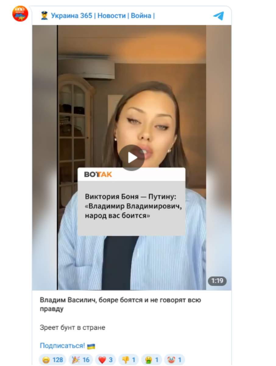 Populārā krievu blogere un bijusī šova “Dom-2” dalībniece Viktorija Bonja (ar 12,9 miljoniem sekotāju vietnē Instagram) ierakstījusi video vēstījumu diktatoram Vladimiram Putinam, kurā paziņo, ka starp valdību un sabiedrību ir izaugusi “bieza siena” un valstī pieaug bīstama spriedze.