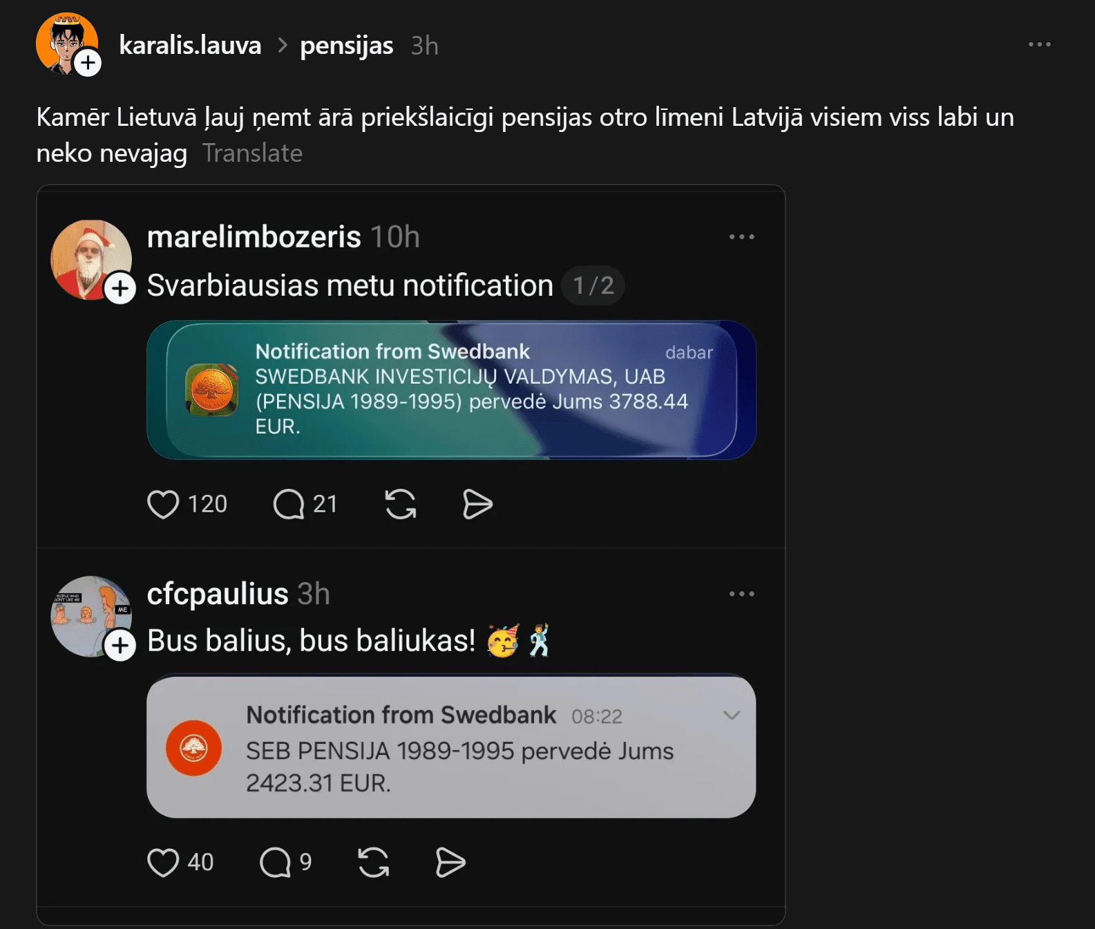 Vienlaikus cits lietotājs ir skarbāks, atsaucoties uz jaunumiem par Lietuvu: “Kamēr Lietuvā ļauj ņemt ārā priekšlaicīgi pensijas otro līmeni Latvijā visiem viss labi un neko nevajag.”