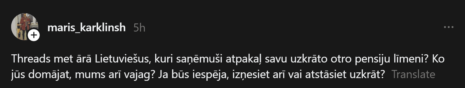 Piemēram, Māris vaicā: “Threads met ārā Lietuviešus, kuri saņēmuši atpakaļ savu uzkrāto otro pensiju līmeni? Ko jūs domājat, mums arī vajag? Ja būs iespēja, izņesiet arī vai atstāsiet uzkrāt?”