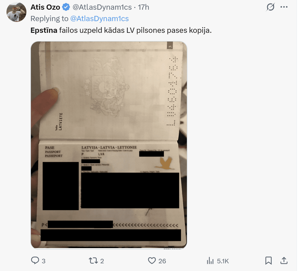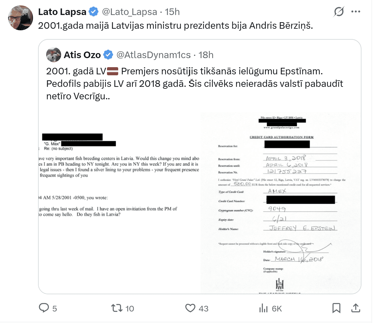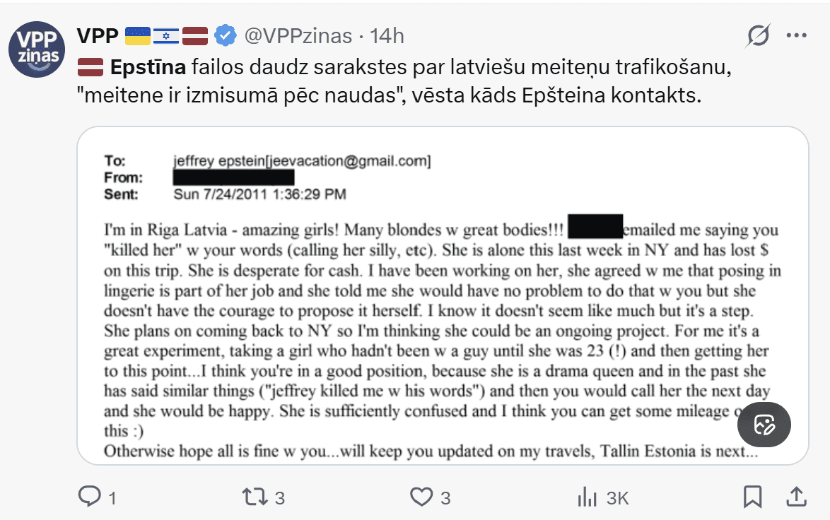 Džefrija Epstīna lietas jaunākie dokumenti, kuros minēti pasaules elites pārstāvji – Tramps, Geitss, Brensons, Endrū un citi –, ir izraisījuši kārtējo triecienvilni mediju telpā. Taču šoreiz uzmanību piesaista arī negaidīta detaļa: starp daudzajiem uzvārdiem un atsaucēm uz ietekmīgiem personāžiem parādās arī Latvijas vārds.