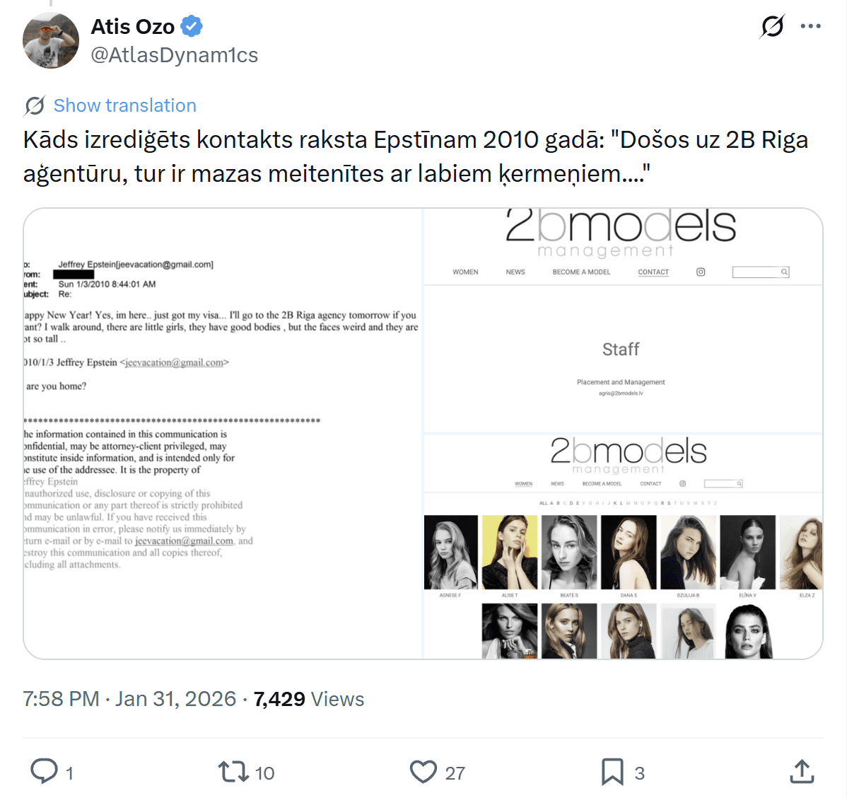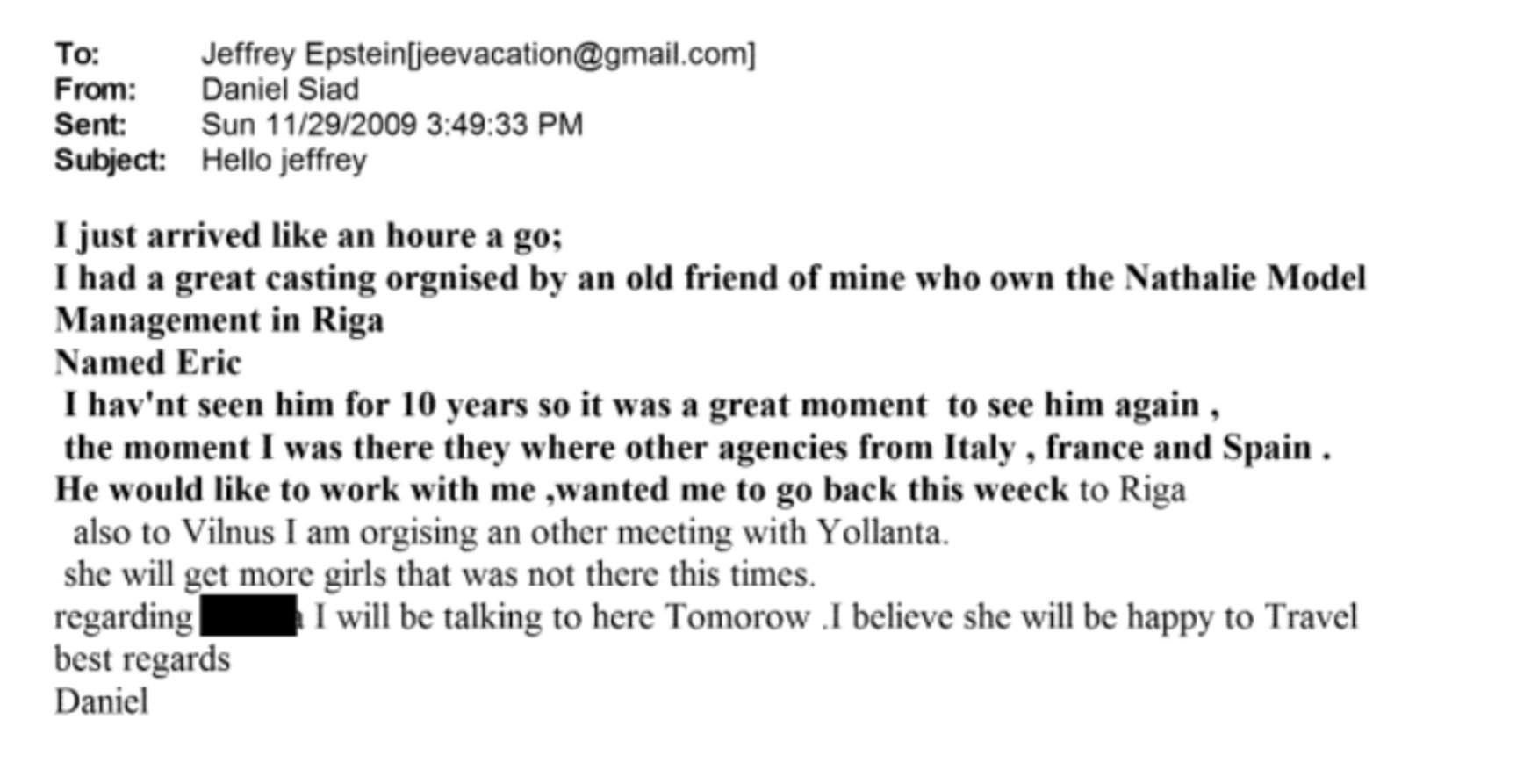 *Es esmu Rīgā, Latvijā – neticamas meitenes! Daudz blondīņu ar lieliskām figūrām!!! [rediģēts] man atsūtīja e-pastu, kurā teikts, ka tu viņu “nogalināji” ar saviem vārdiem (saucot viņu par muļķīti utt.). Viņa šonedēļ ir viena pati Ņujorkā un šajā braucienā ir zaudējusi naudu. Viņa izmisīgi meklē naudu. Es ar viņu strādāju – viņa piekrita man, ka pozēt apakšveļā ir daļa no viņas darba, un viņa man teica, ka viņai nebūtu problēmu to darīt arī ar tevi, bet viņai nav drosmes to piedāvāt pašai. Zinu, ka tas neizklausās pēc kaut kā liela, bet tas ir solis. Viņa plāno atgriezties Ņujorkā, tāpēc es domāju, ka viņa varētu kļūt par ilgtermiņa “projektu”,” teikts e-pastā.