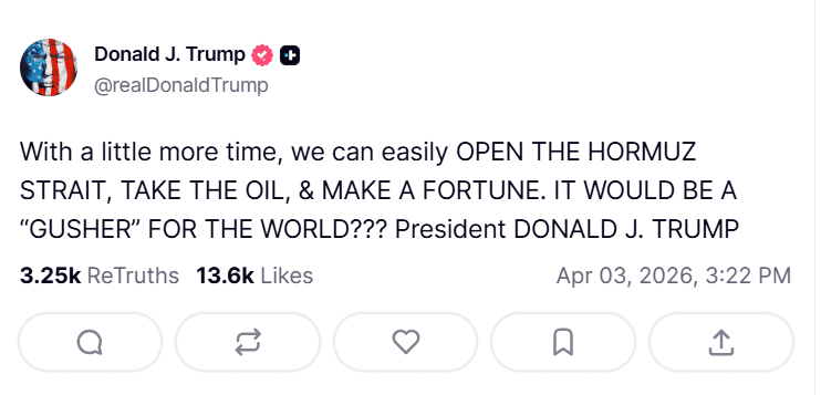 Baltā nama vadītājs norādīja, ka ASV tuvākajā laikā varētu “vieglā veidā atvērt Hormuza šaurumu” un pārņemt visu naftu, “iegūstot lielu peļņu”. Tāpat Tramps pieminēja iespējamos ieguvumus arī citām valstīm.