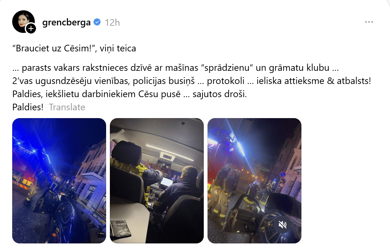 Sociālajos tīklos Grencberga dalījusies ar visai satraucošu brīdi, ko viņai nācies piedzīvot: “Brauciet uz Cēsim!”, viņi teica… parasts vakars rakstnieces dzīvē ar mašīnas “sprādzienu“ un grāmatu klubu … 2’vas ugusndzēsēju vienības, policijas busiņš … protokoli … ieliska attieksme & atbalsts! Paldies, iekšlietu darbiniekiem Cēsu pusē … sajutos droši.