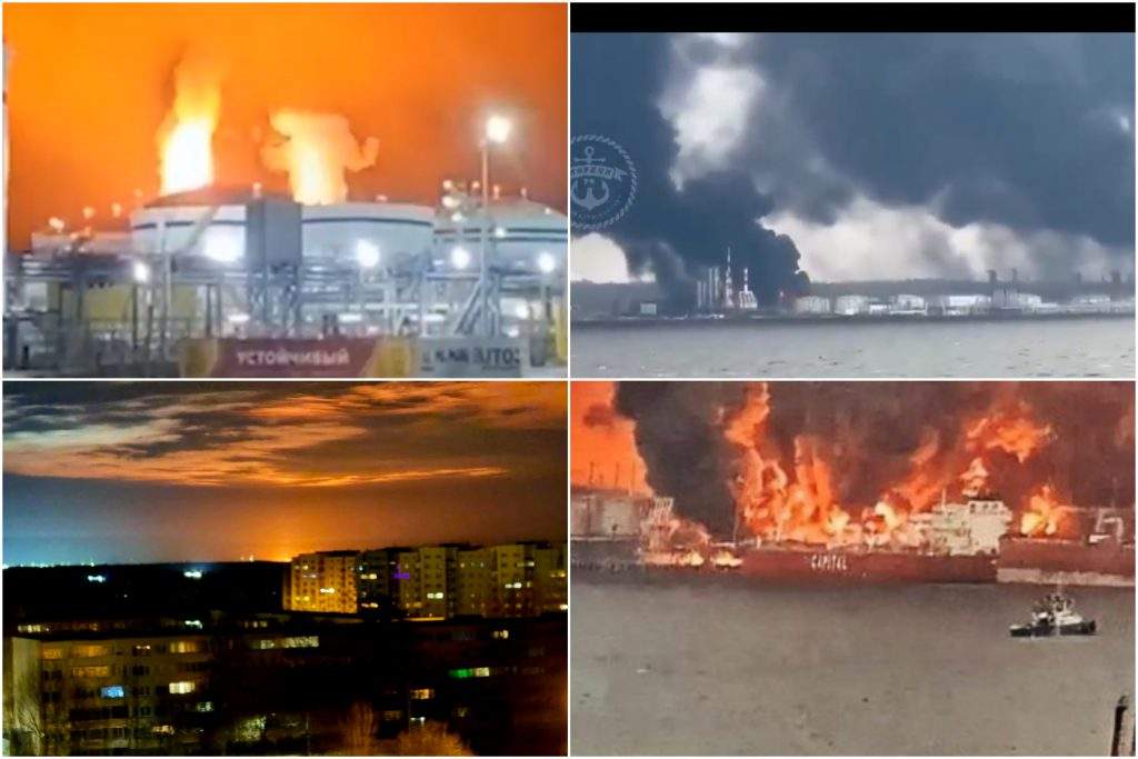 Bezpilota lidaparāti, pārvarējuši vairākus Krievijas pretgaisa aizsardzības ešelonus, nolidoja aptuveni 1000 kilometru un, pēc visa spriežot, guva tiešus trāpījumus. Trieciena rezultātā debesis virs Baltijas jūras ostas iekrāsojās spilgti oranžā krāsā no ugunsgrēka plosīšanās.