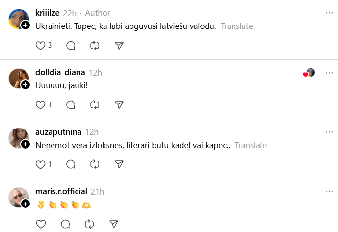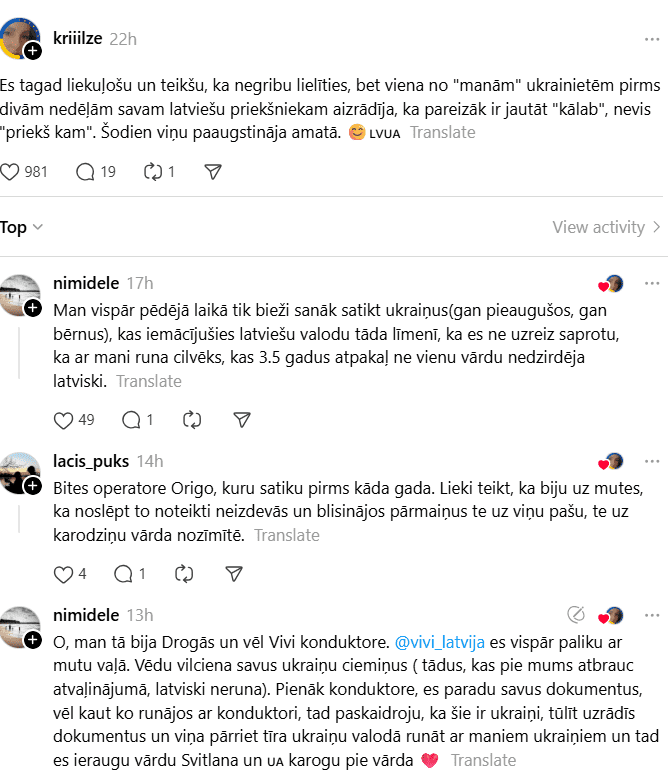 “Man vispār pēdējā laikā tik bieži sanāk satikt ukraiņus (gan pieaugušos, gan bērnus), kas iemācījušies latviešu valodu tāda līmenī, ka es ne uzreiz saprotu, ka ar mani runa cilvēks, kas 3.5 gadus atpakaļ ne vienu vārdu nedzirdēja latviski,” kāds komentāros raksta.