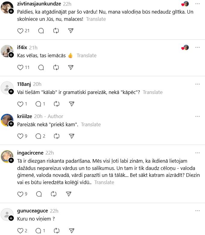 “Es tagad liekuļošu un teikšu, ka negribu lielīties, bet viena no “manām” ukrainietēm pirms divām nedēļām savam latviešu priekšniekam aizrādīja, ka pareizāk ir jautāt “kālab”, nevis “priekš kam”. Šodien viņu paaugstināja amatā,” viņa Threads raksta.