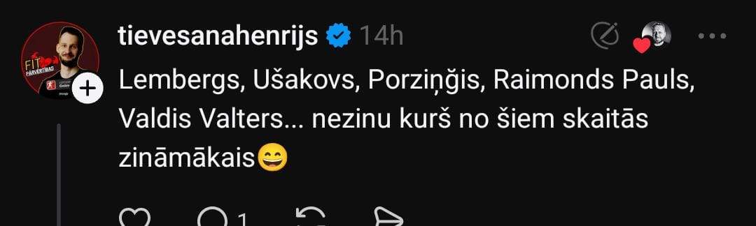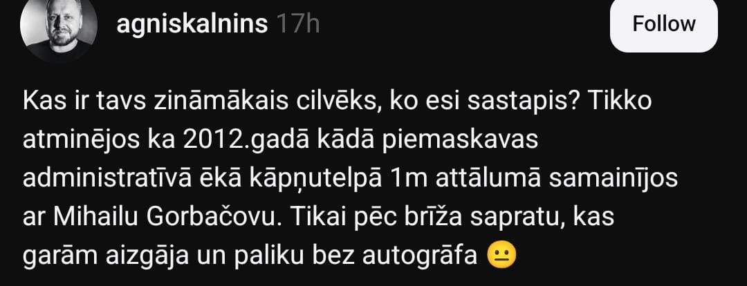Agnis sociālo mediju platformā “Threads” aizsāk diskusiju: “Kas ir tavs zināmākais cilvēks, ko esi sastapis? Tikko atminējos ka 2012.gadā kādā piemaskavas administratīvā ēkā kāpņutelpā 1 metra attālumā samainījos ar Mihailu Gorbačovu. Tikai pēc brīža sapratu, kas garām aizgāja un paliku bez autogrāfa.”
