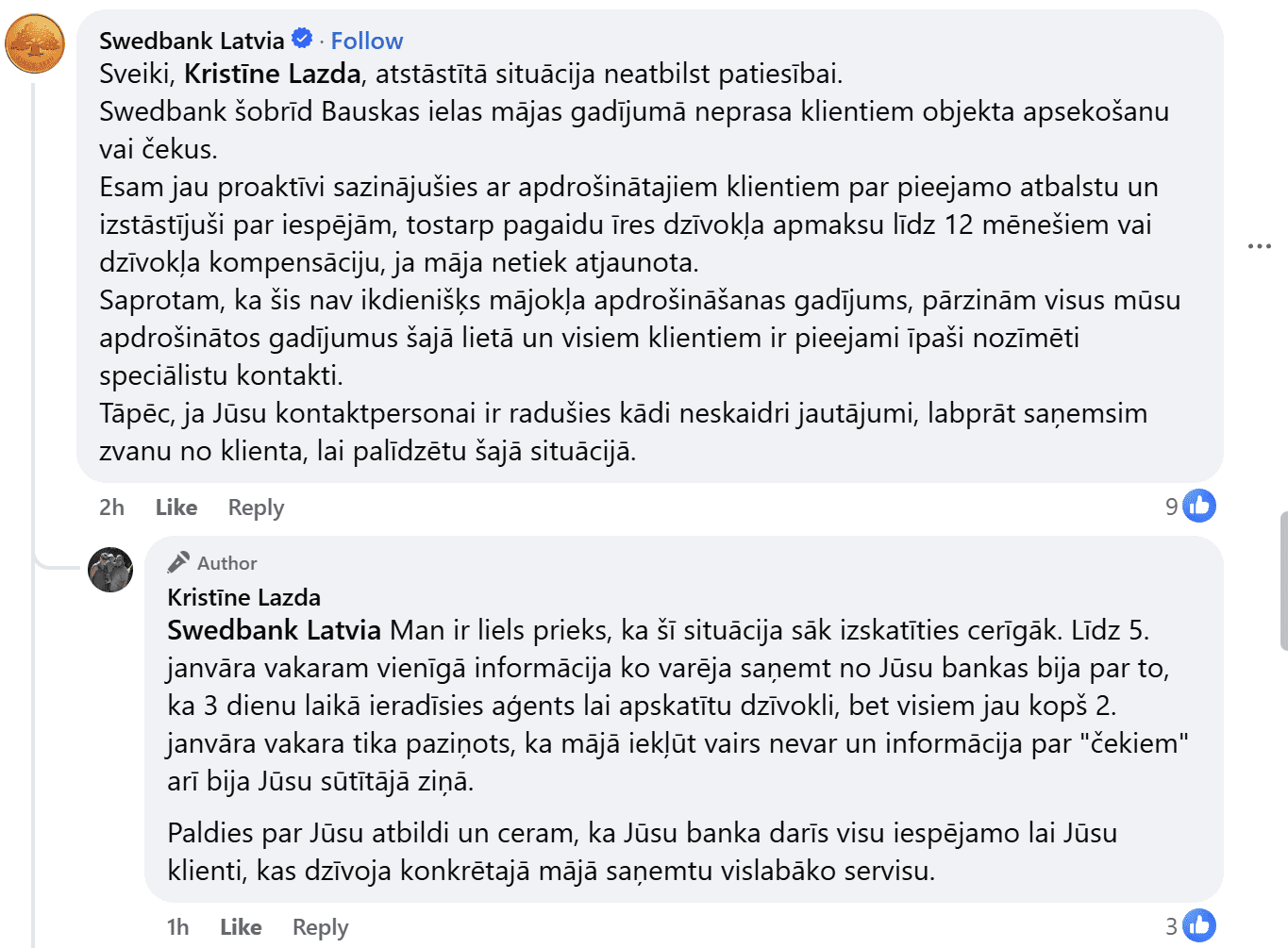Kristīne gan norādīja, ka līdz 5. janvāra vakaram vienīgā informācija, ko varēja saņemt no “Swedbank” bija par to, ka 3 dienu laikā ieradīsies aģents, lai apskatītu dzīvokli. Kā arī – informācija par čekiem arī bijusi bankas sūtītajā ziņā. Tomēr viņa pateicās, ka situācija sāk izskatīties cerīgāk.