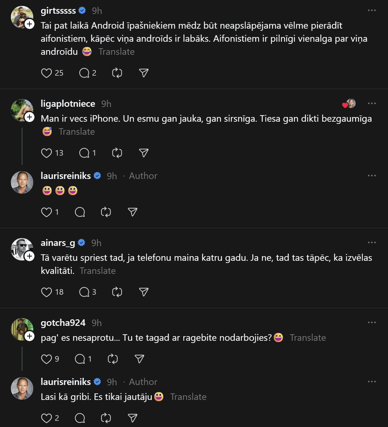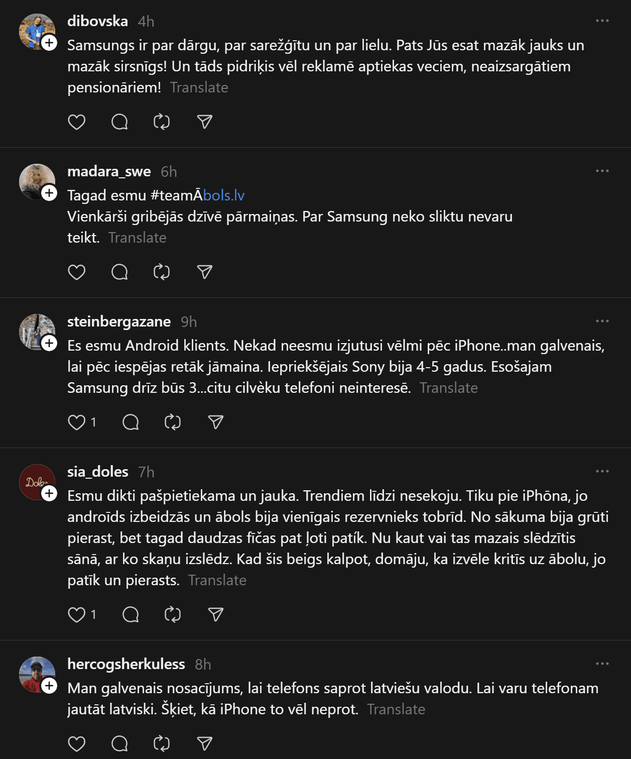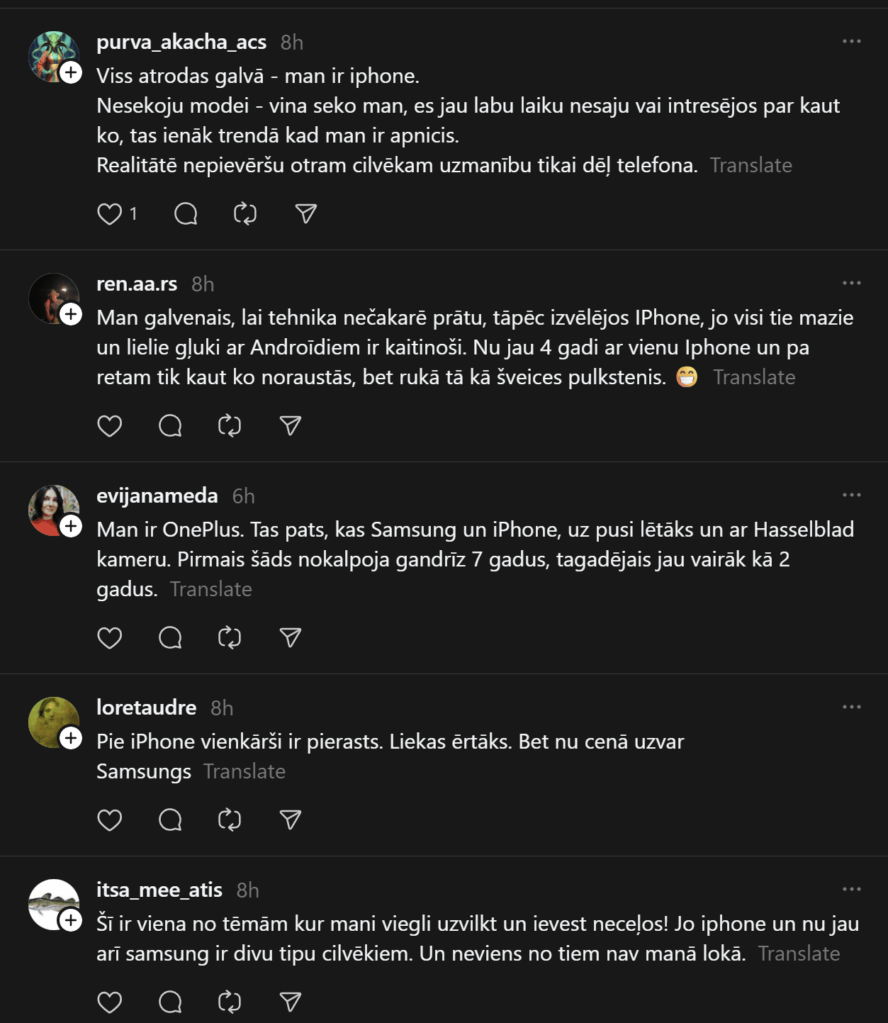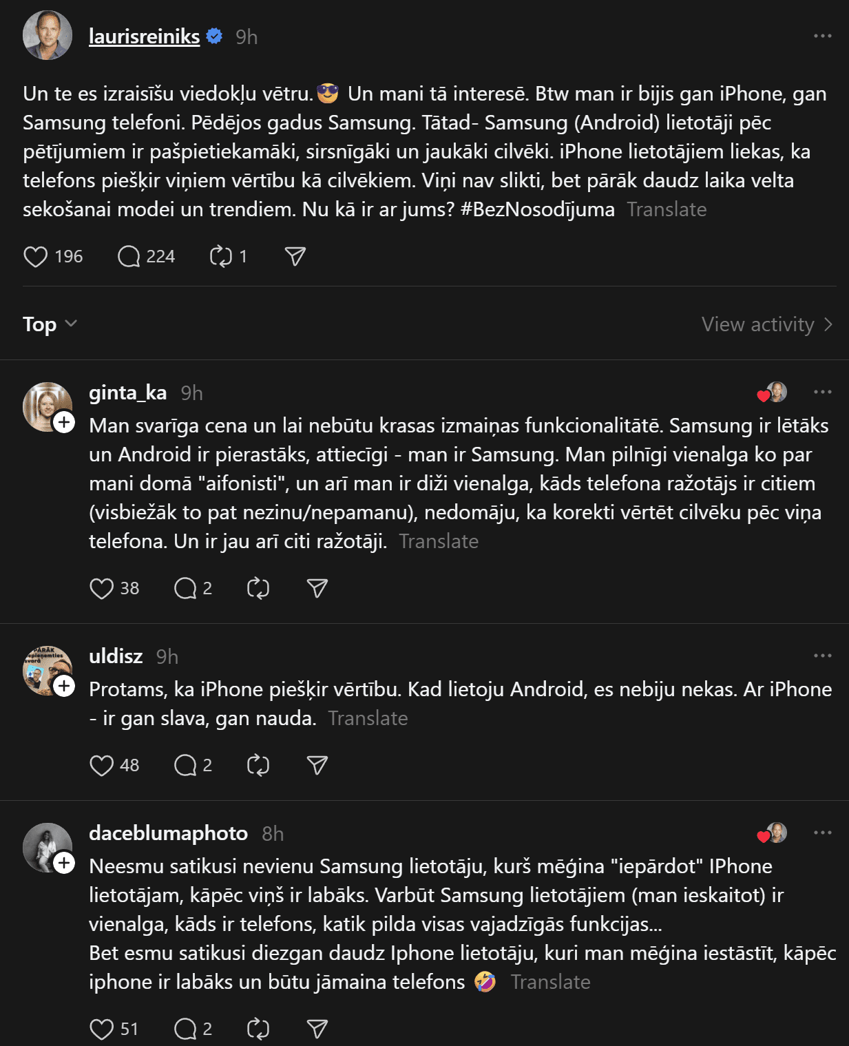 “Un te es izraisīšu viedokļu vētru. Un mani tā interesē. Man ir bijis gan iPhone, gan Samsung telefoni. Pēdējos gadus Samsung. Tātad – Samsung (Android) lietotāji pēc pētījumiem ir pašpietiekamāki, sirsnīgāki un jaukāki cilvēki. iPhone lietotājiem liekas, ka telefons piešķir viņiem vērtību kā cilvēkiem. Viņi nav slikti, bet pārāk daudz laika velta sekošanai modei un trendiem. Nu kā ir ar jums?
