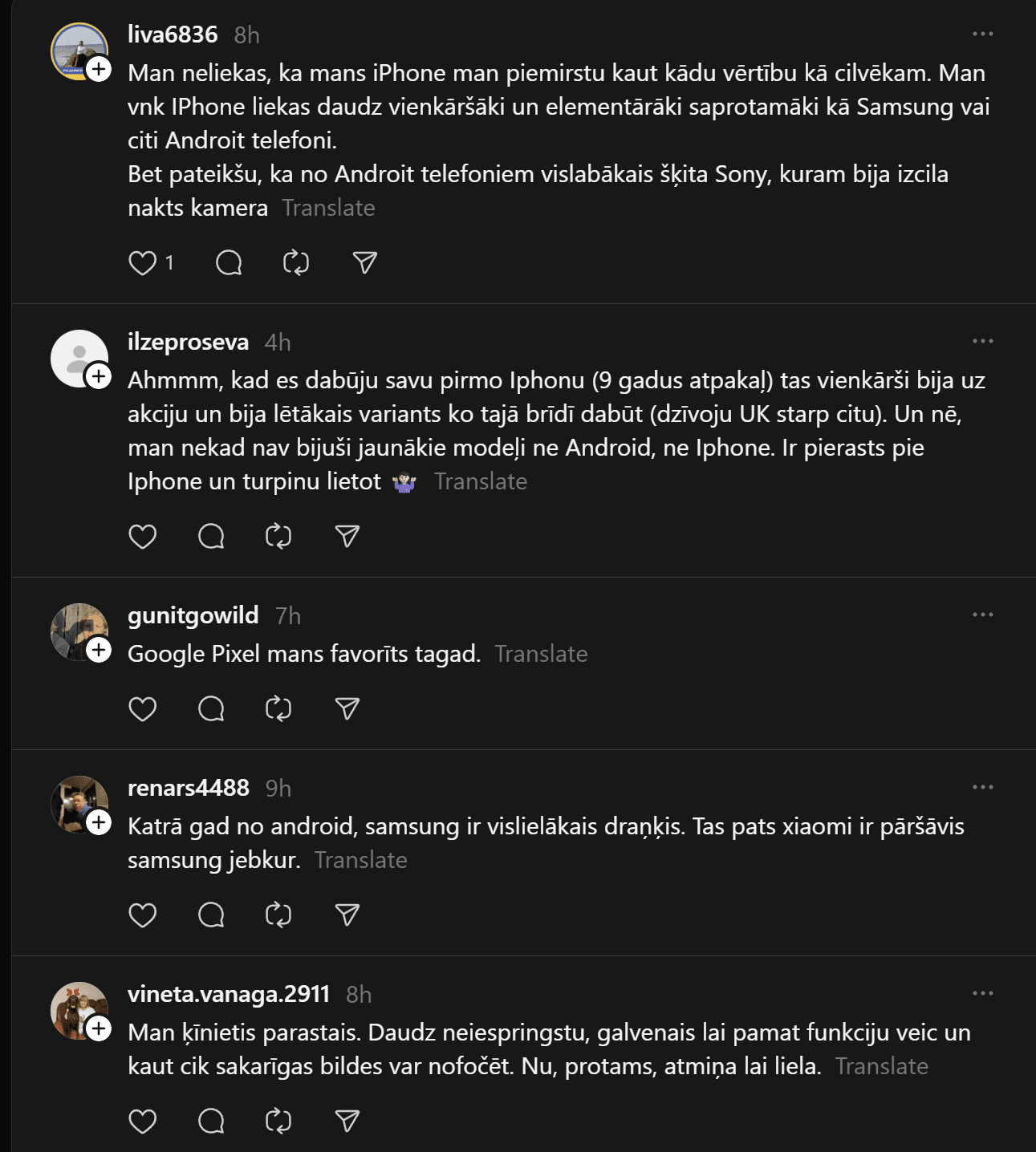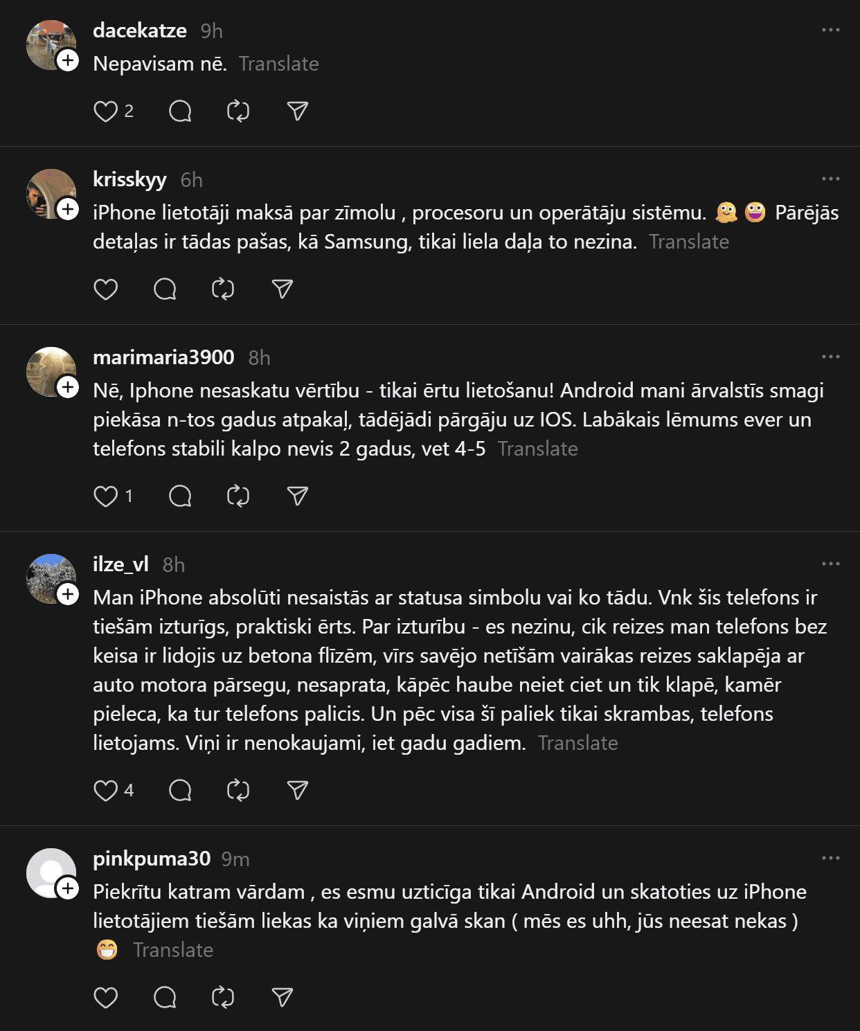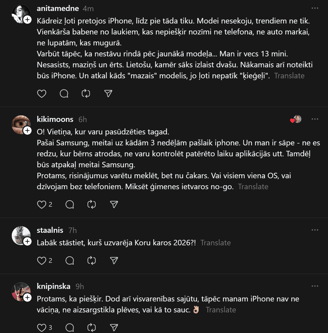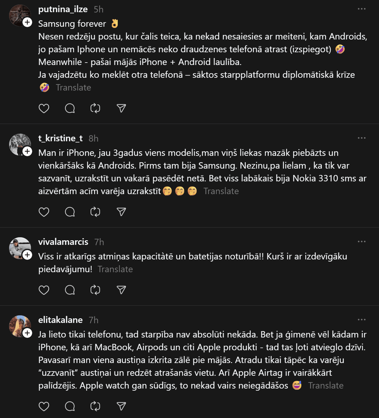 “Un te es izraisīšu viedokļu vētru. Un mani tā interesē. Man ir bijis gan iPhone, gan Samsung telefoni. Pēdējos gadus Samsung. Tātad – Samsung (Android) lietotāji pēc pētījumiem ir pašpietiekamāki, sirsnīgāki un jaukāki cilvēki. iPhone lietotājiem liekas, ka telefons piešķir viņiem vērtību kā cilvēkiem. Viņi nav slikti, bet pārāk daudz laika velta sekošanai modei un trendiem. Nu kā ir ar jums?