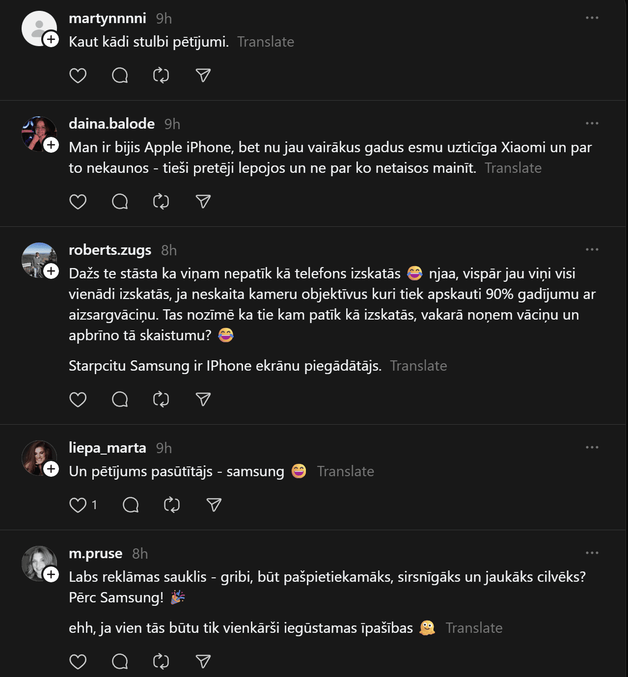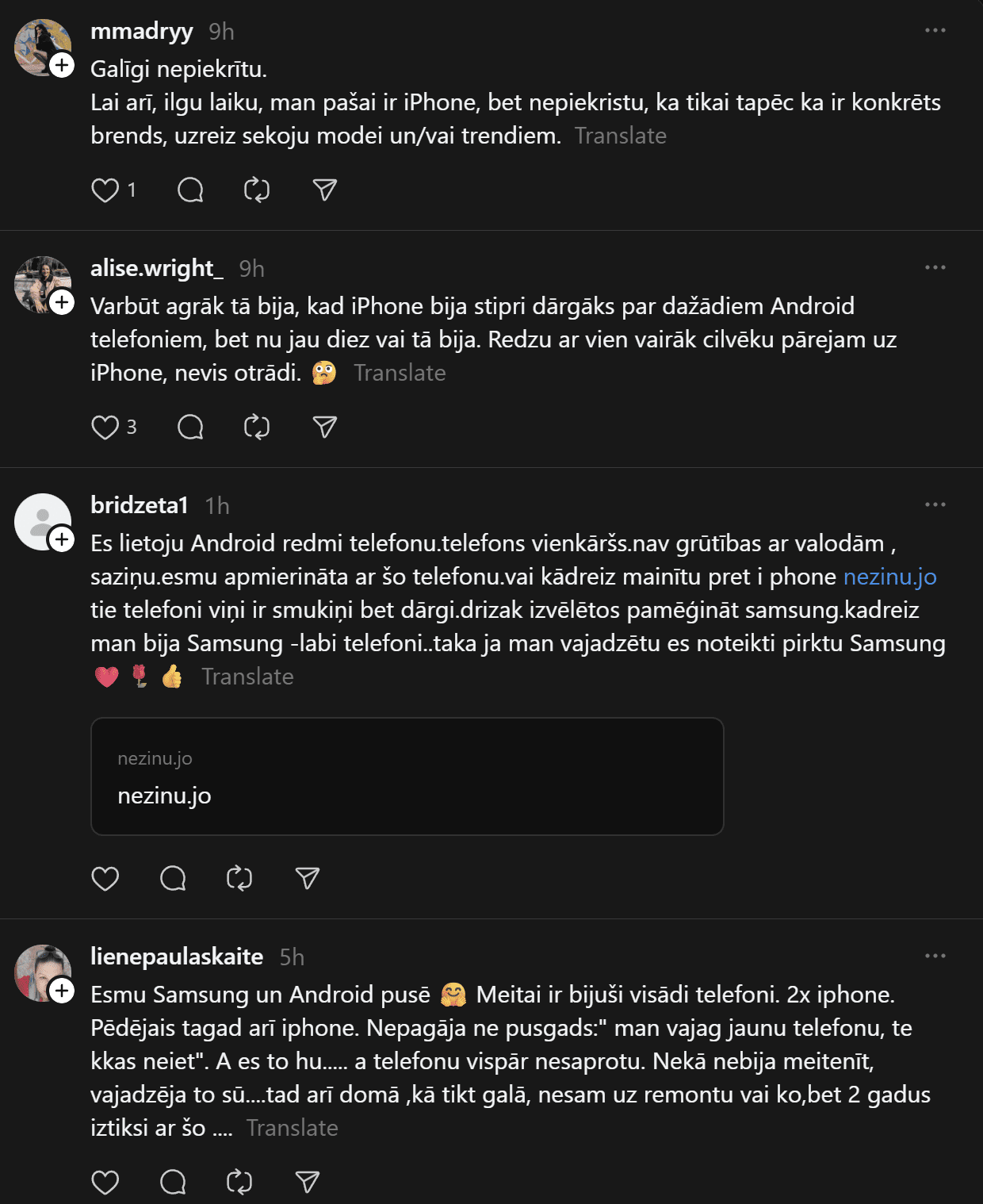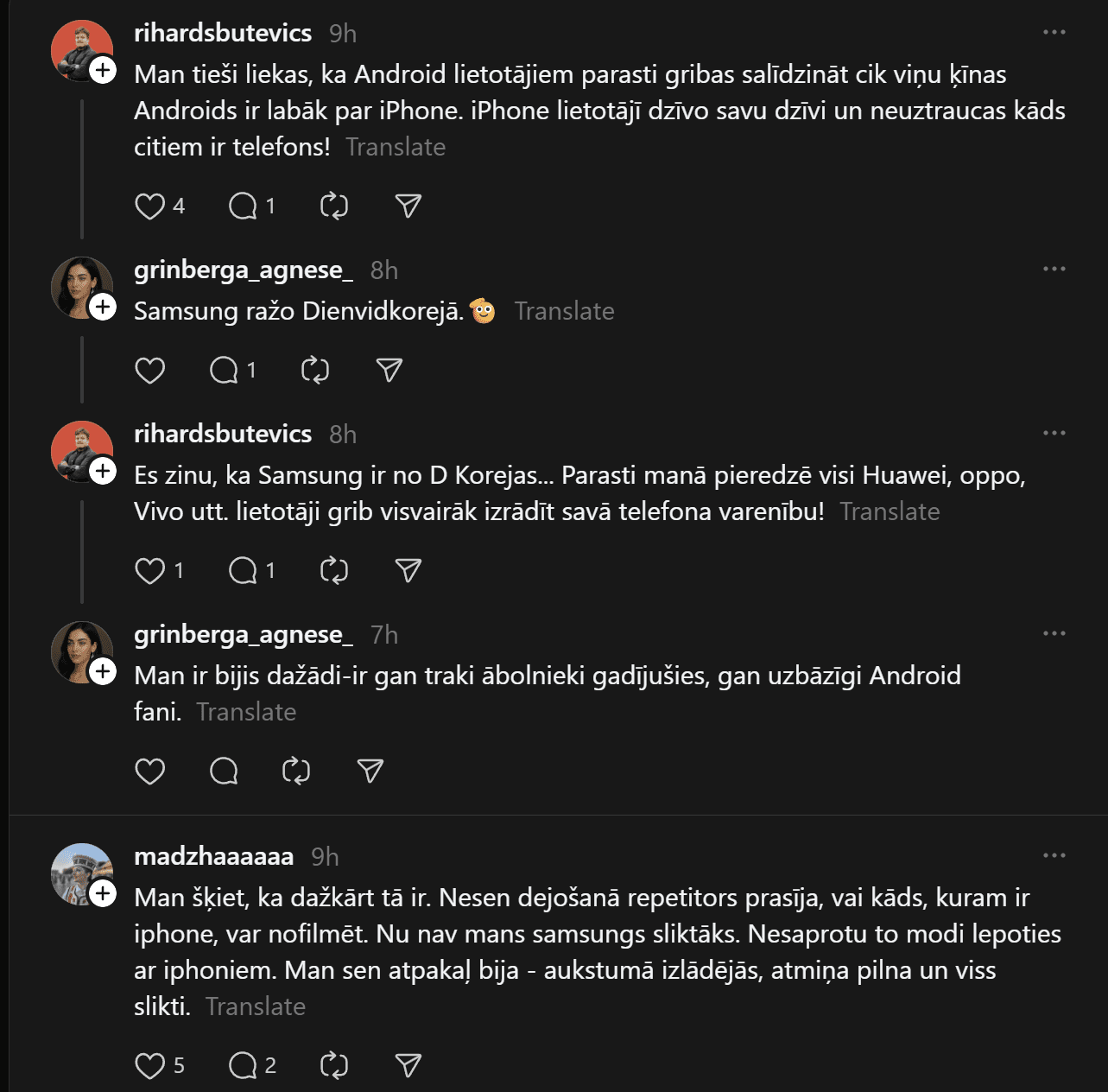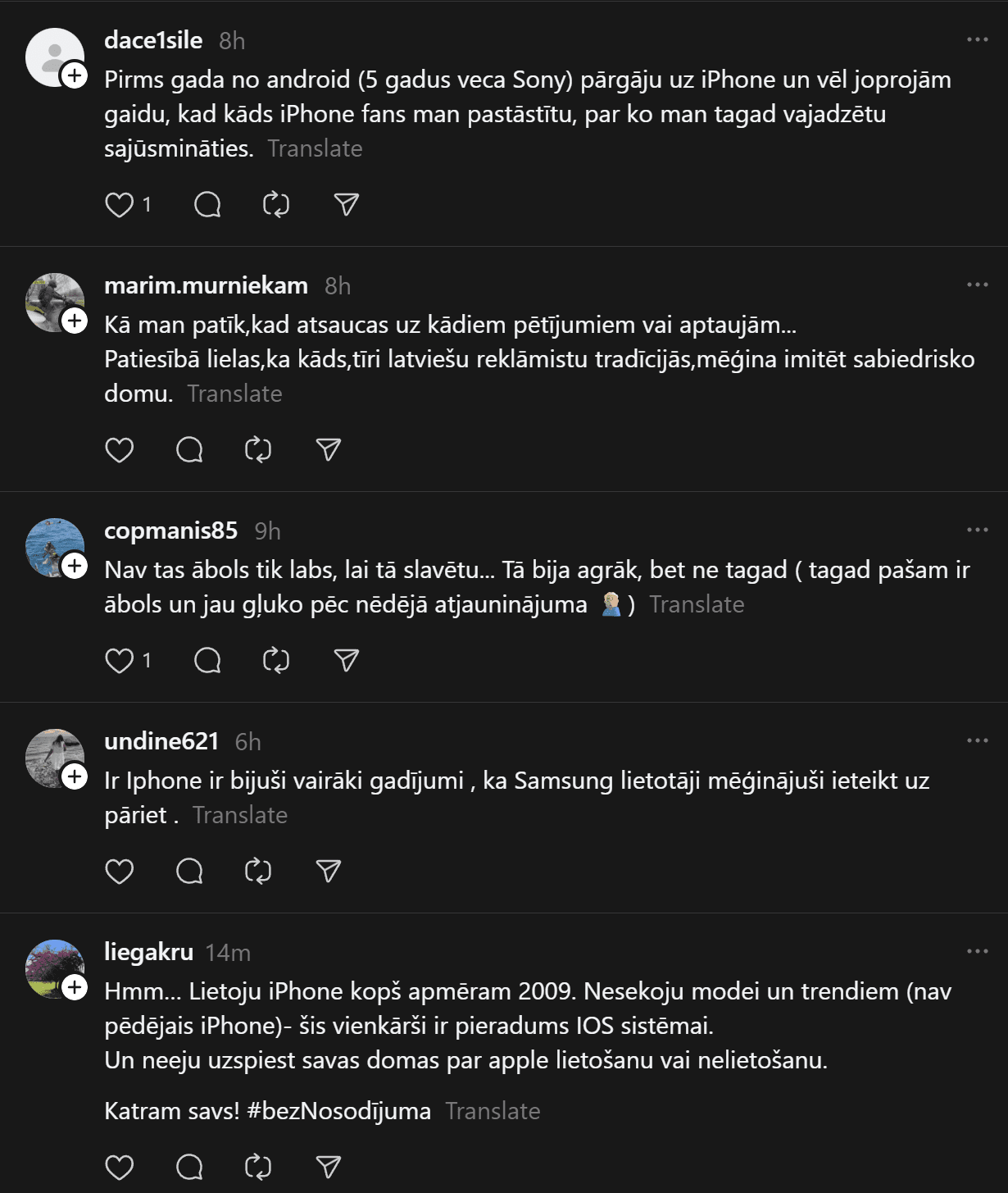 “Un te es izraisīšu viedokļu vētru. Un mani tā interesē. Man ir bijis gan iPhone, gan Samsung telefoni. Pēdējos gadus Samsung. Tātad – Samsung (Android) lietotāji pēc pētījumiem ir pašpietiekamāki, sirsnīgāki un jaukāki cilvēki. iPhone lietotājiem liekas, ka telefons piešķir viņiem vērtību kā cilvēkiem. Viņi nav slikti, bet pārāk daudz laika velta sekošanai modei un trendiem. Nu kā ir ar jums?