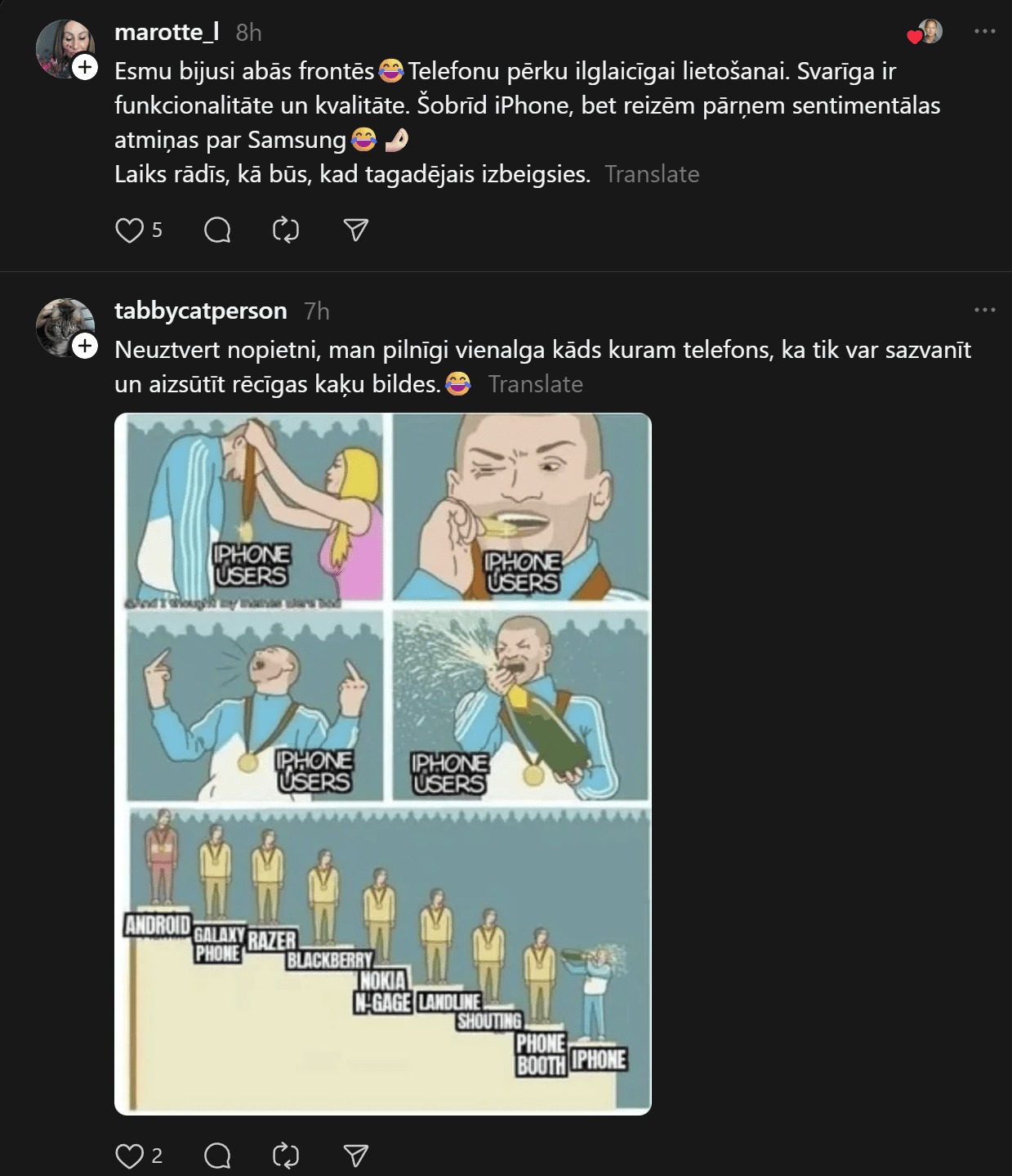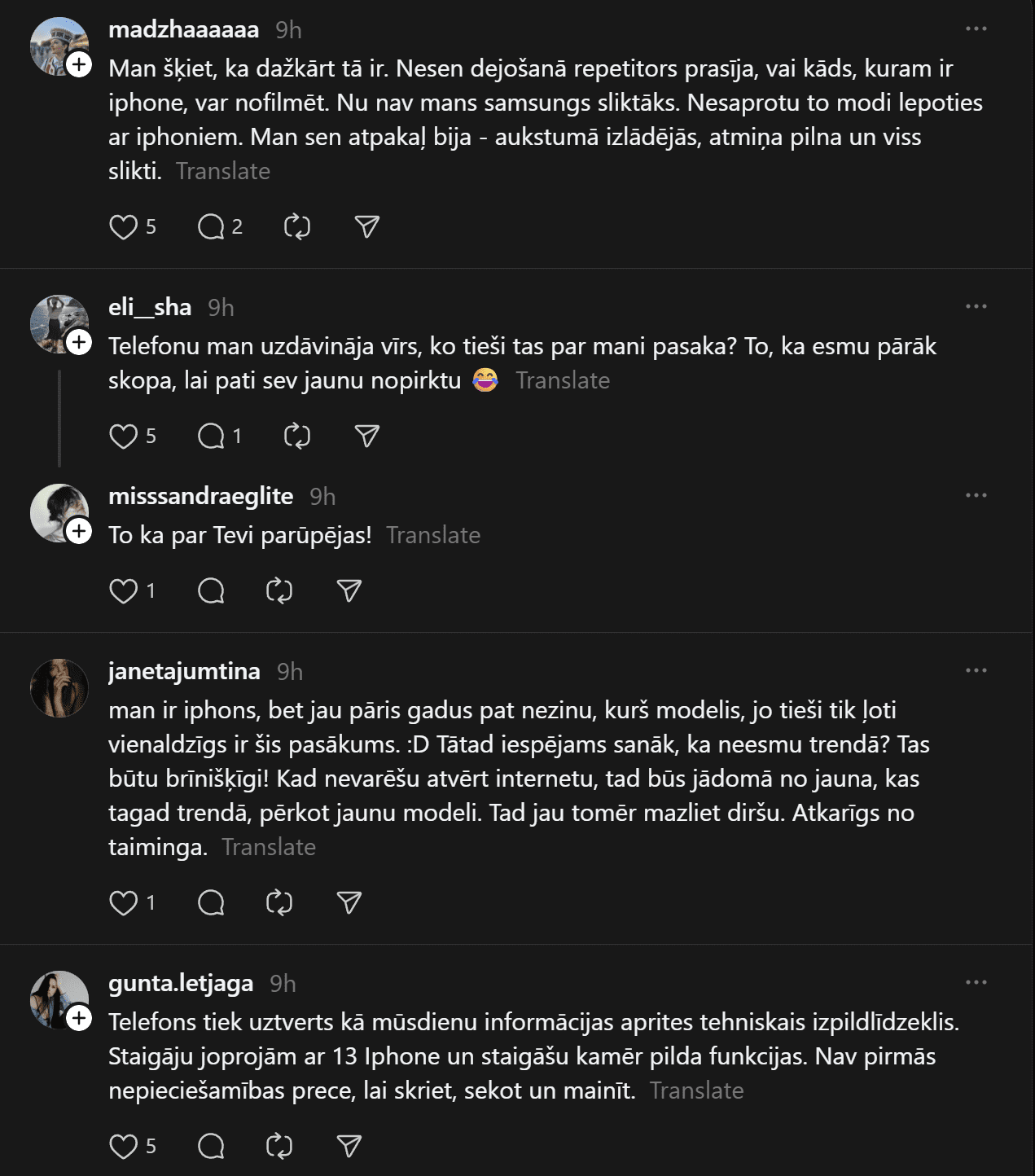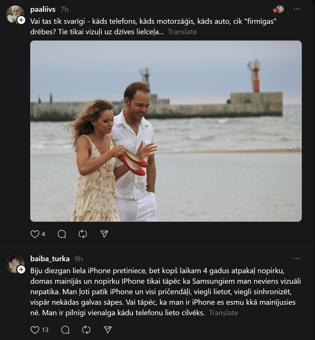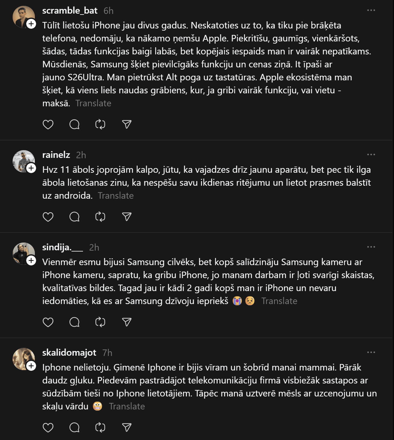 “Un te es izraisīšu viedokļu vētru. Un mani tā interesē. Man ir bijis gan iPhone, gan Samsung telefoni. Pēdējos gadus Samsung. Tātad – Samsung (Android) lietotāji pēc pētījumiem ir pašpietiekamāki, sirsnīgāki un jaukāki cilvēki. iPhone lietotājiem liekas, ka telefons piešķir viņiem vērtību kā cilvēkiem. Viņi nav slikti, bet pārāk daudz laika velta sekošanai modei un trendiem. Nu kā ir ar jums?