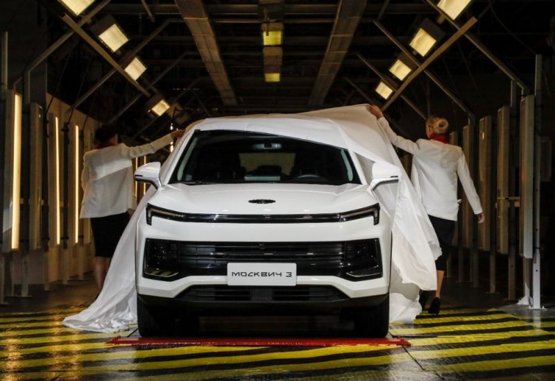 Krievija publiskojusi publicitātes foto, kur redzams, kā strādnieki uz konveijera montē jaunus krosoverus Moskvich-3 Maskavas automobiļu rūpnīcā “Moskvich”, Maskavā.