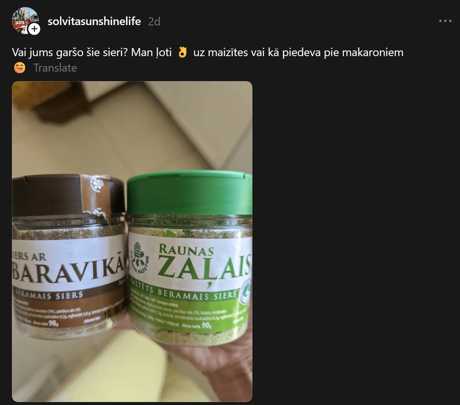 Arī šoreiz stāsts par kādu daudziem, iespējams, nezināmu pārtikas produktu, ko iecienījuši latvieši. Ar to vietnē “Threads” dalās Solvita. “Vai jums garšo šie sieri? Man ļoti! Uz maizītes vai kā piedeva pie makaroniem,” priekā dalās sieviete.