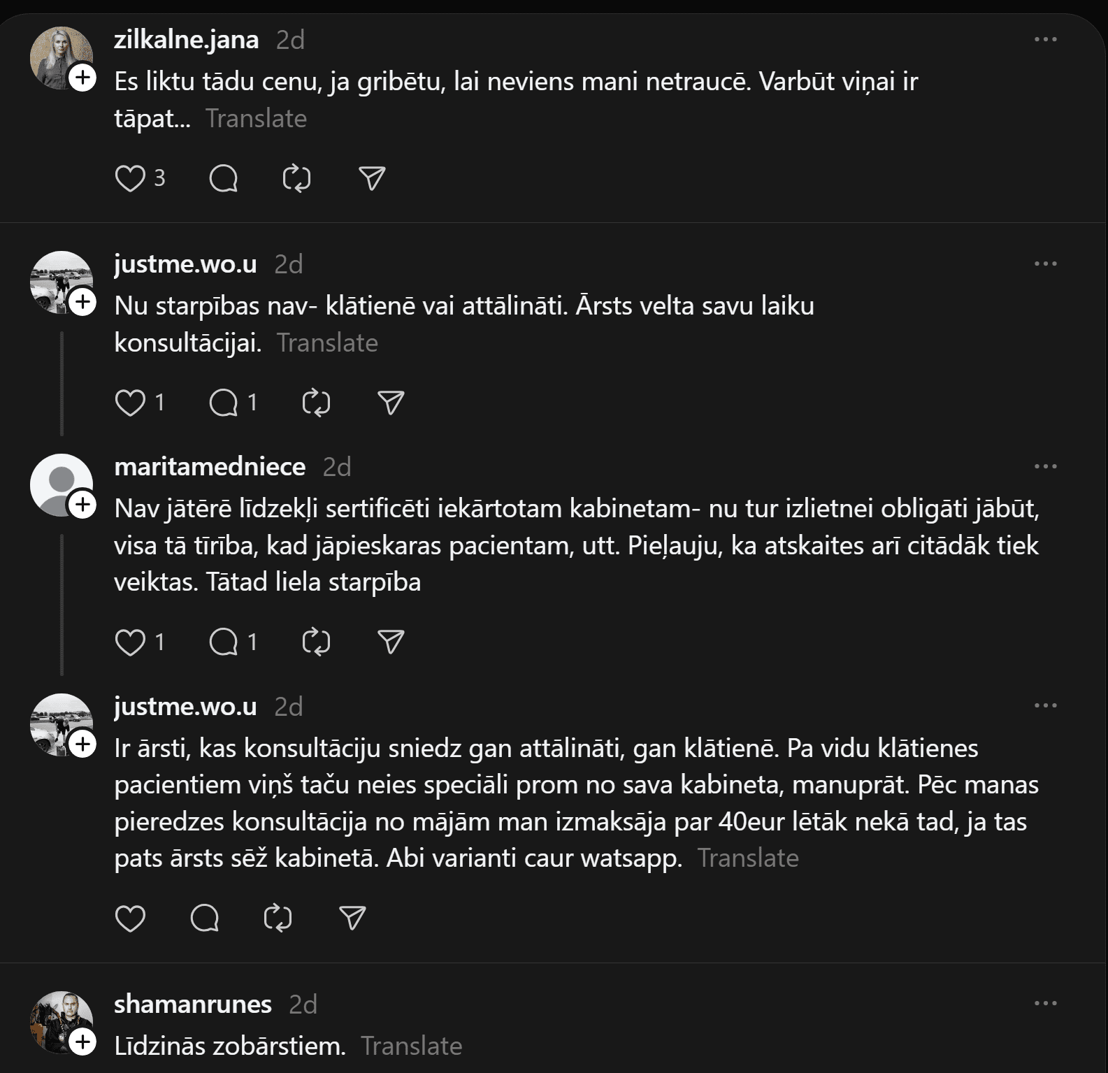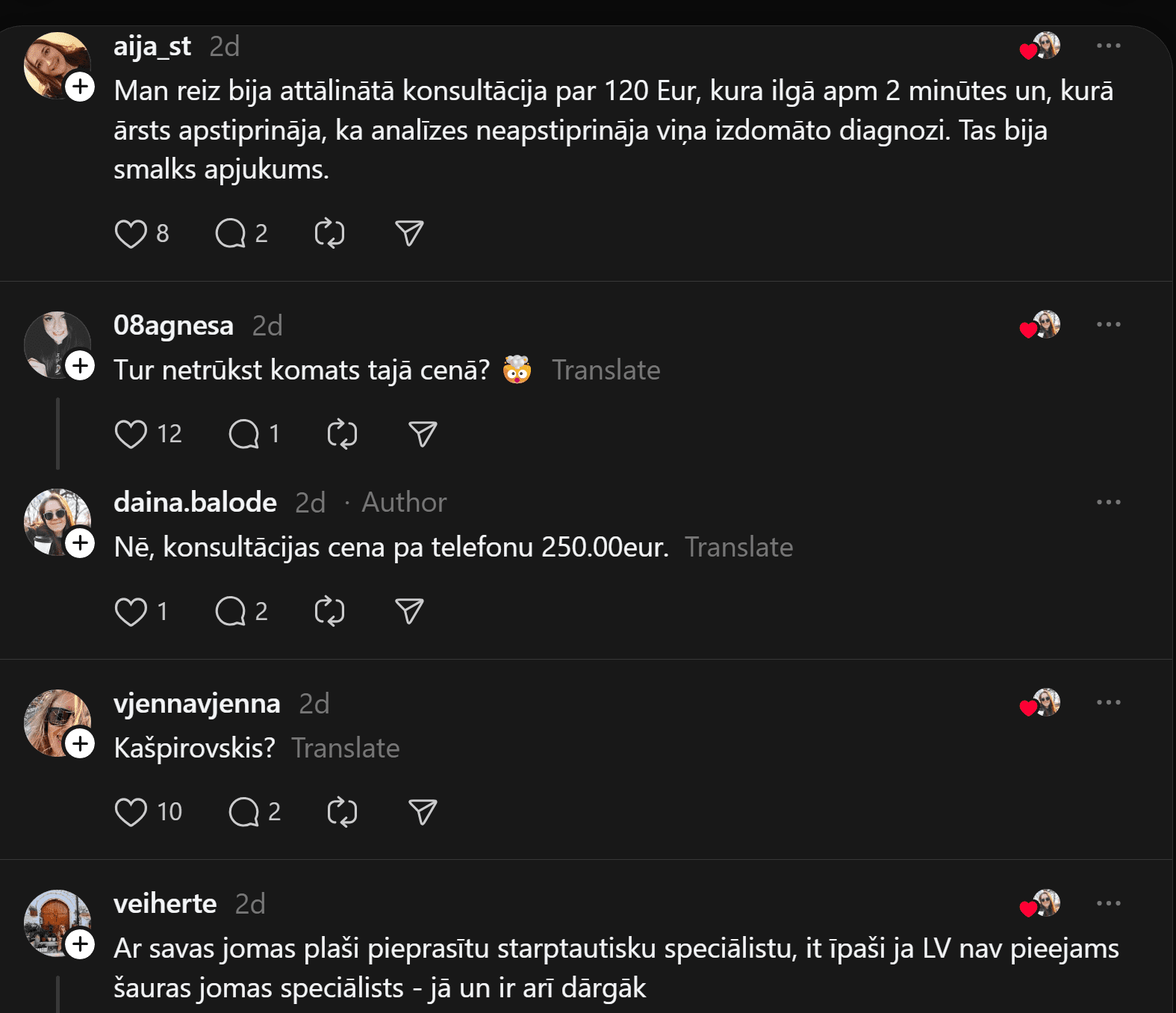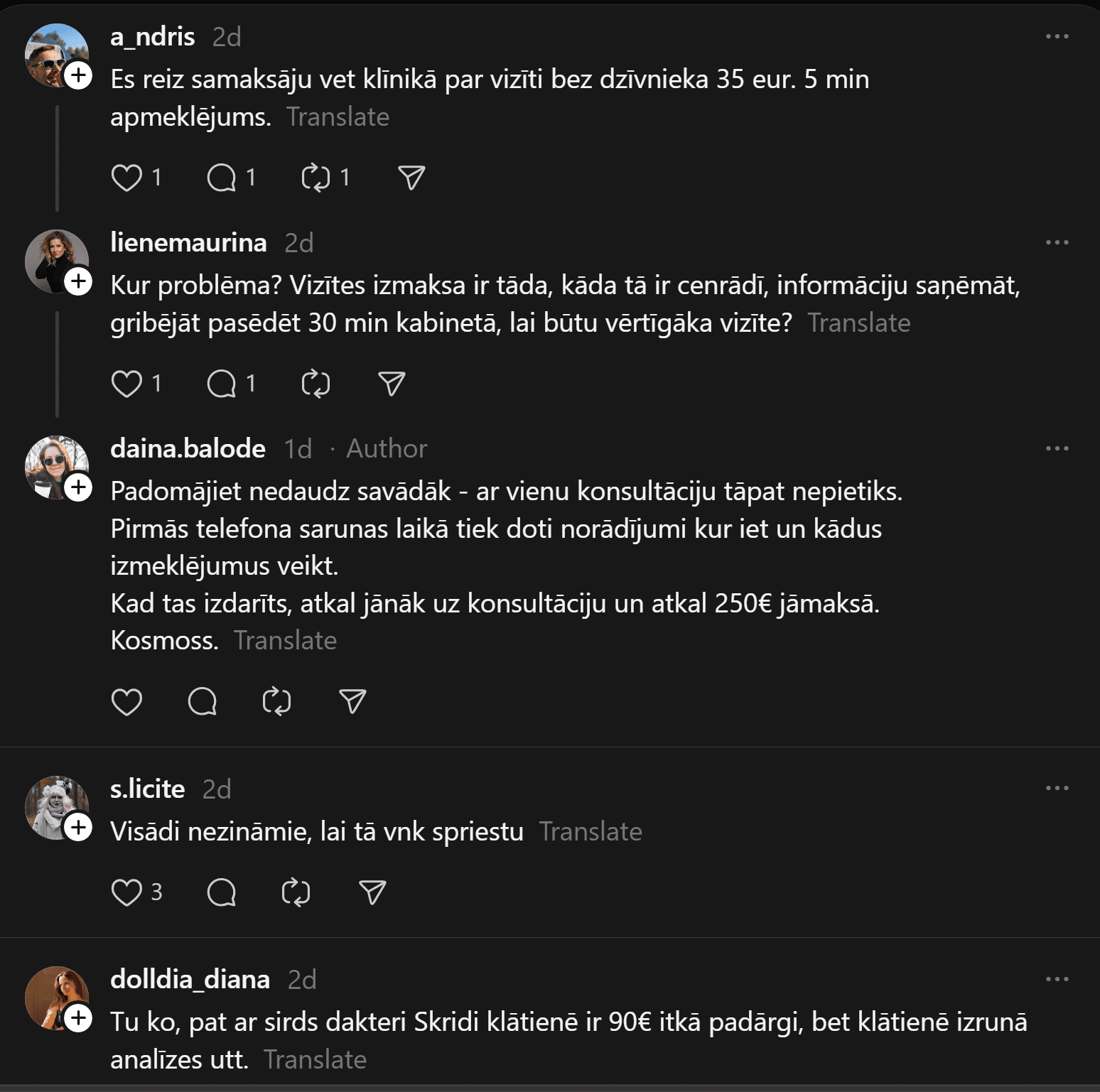 Ja medicīnas pakalpojumu apmaksājam paši, nereti pie ārsta vai uz izmeklējumu var tikt jau pat nākamajā dienā. Kāda soctīklotāja, kura izmantojusi maksas vizīti, vietnē “Threads” dalās pieredzē, cik samaksājusi par telefonsarunu ar ārstu.