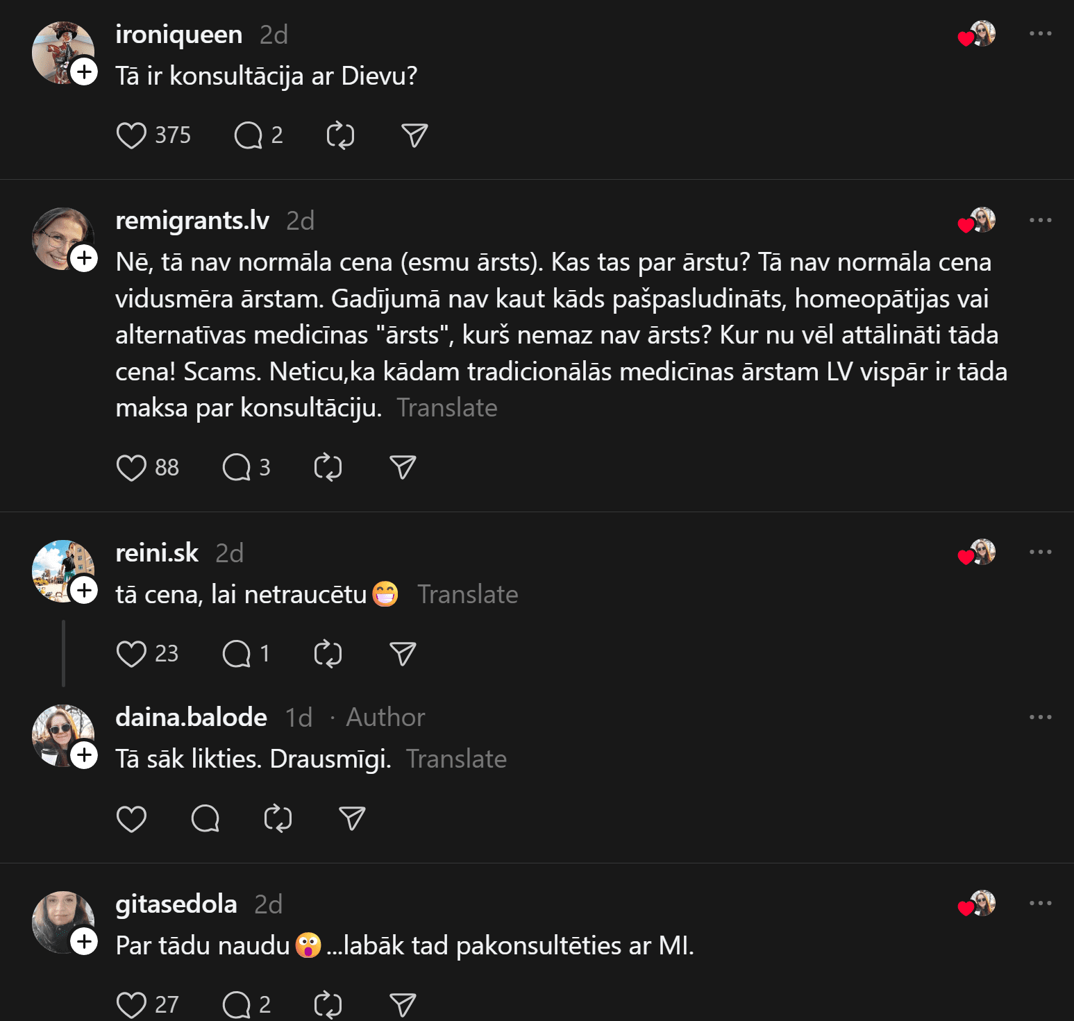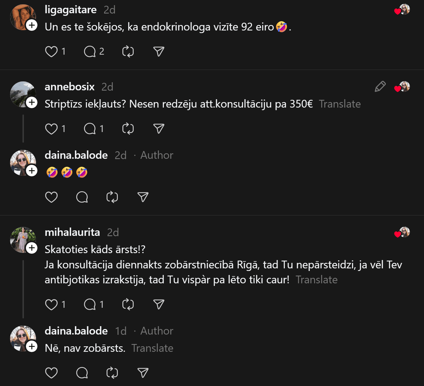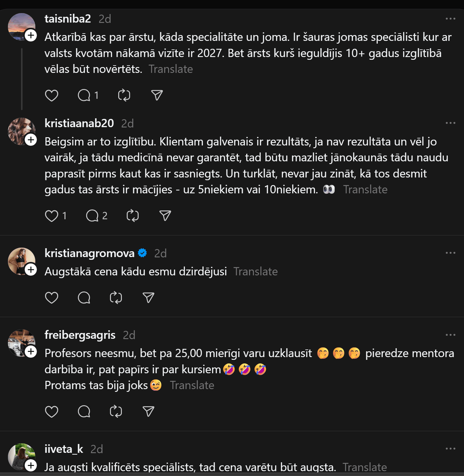Ja medicīnas pakalpojumu apmaksājam paši, nereti pie ārsta vai uz izmeklējumu var tikt jau pat nākamajā dienā. Kāda soctīklotāja, kura izmantojusi maksas vizīti, vietnē “Threads” dalās pieredzē, cik samaksājusi par telefonsarunu ar ārstu.