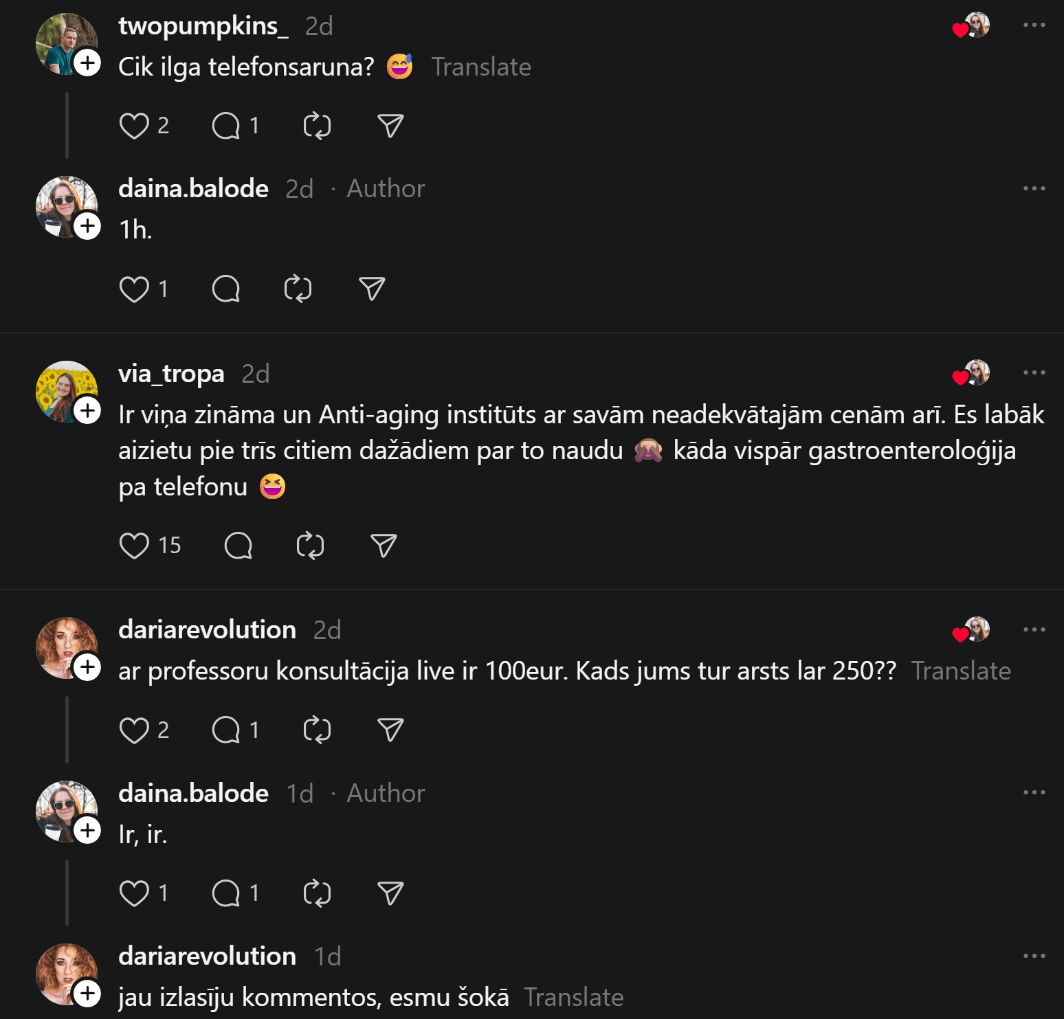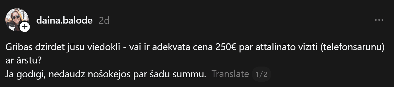“Gribas dzirdēt jūsu viedokli – vai ir adekvāta cena 250€ par attālināto vizīti (telefonsarunu) ar ārstu? Ja godīgi, nedaudz nošokējos par šādu summu,” raksta Daina.