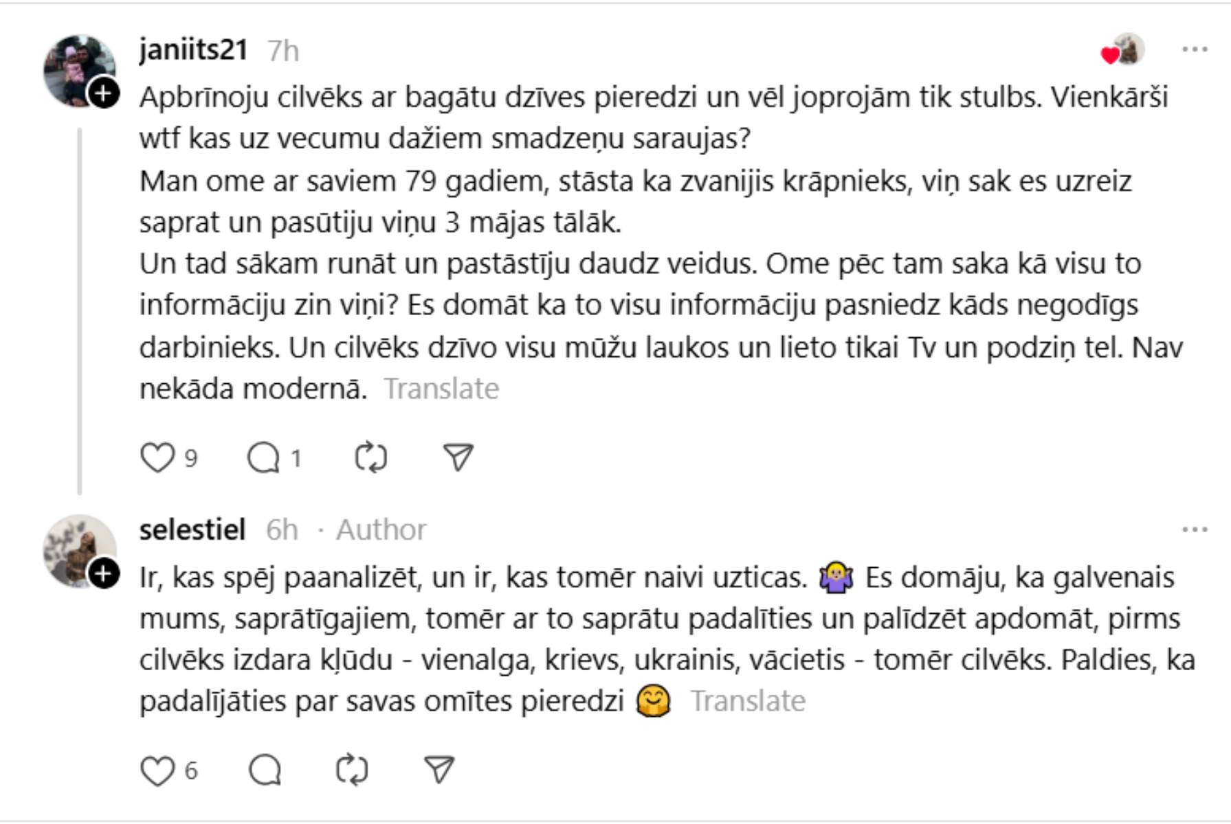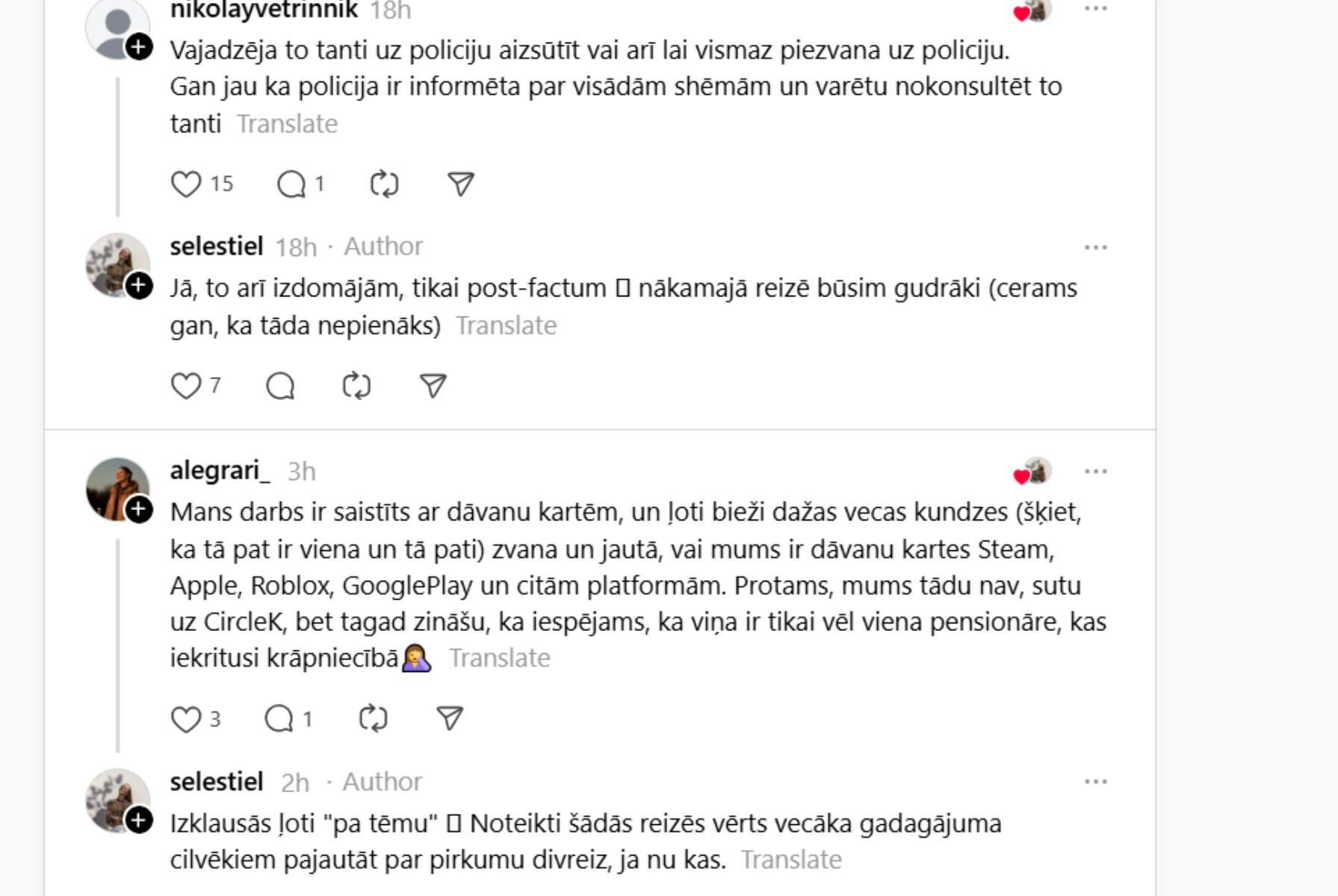 Tas vēsta: “Vīrs šovakar piestāja vietējā Circle K pēc kafijas. Pie kases priekšā pensionāre pērk, kā viņš aprakstīja, 5 cm biezu čupu ar Steam dāvanu kartēm. Ar latviski runājošo pārdevēju komunicēt nespēja – lai palīdzētu ar valodas barjeru, vīrs krieviski pajautāja: “Vai jūs zināt, ko pērkat?” “Man būs sūtījuma piegāde, tā jāapmaksā.”
