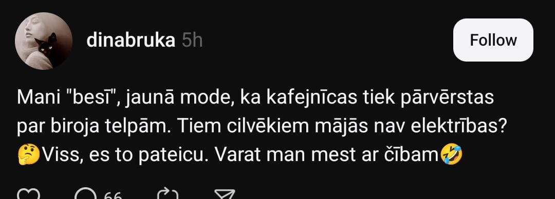 Dina norāda, ka viņu kaitina jaunā tendence kafejnīcas pārvērst par biroja telpām. Viņa ironiski vaicā, vai šiem cilvēkiem mājās nav elektrības? “Viss, es to pateicu. Varat man mest ar čībām,” viņa piebilst.