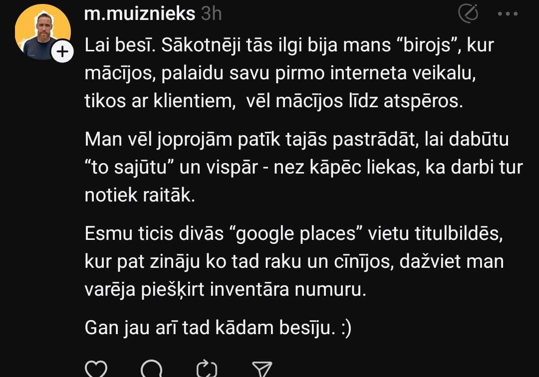 “Pateicoties šiem bomžiem, kuri nevar atļauties noīrēt sev biroju, uz kafejnīcām praktiski vairs neeju. Kāda jēga paņemt kafiju un dzet to turot tasīti rokā.”