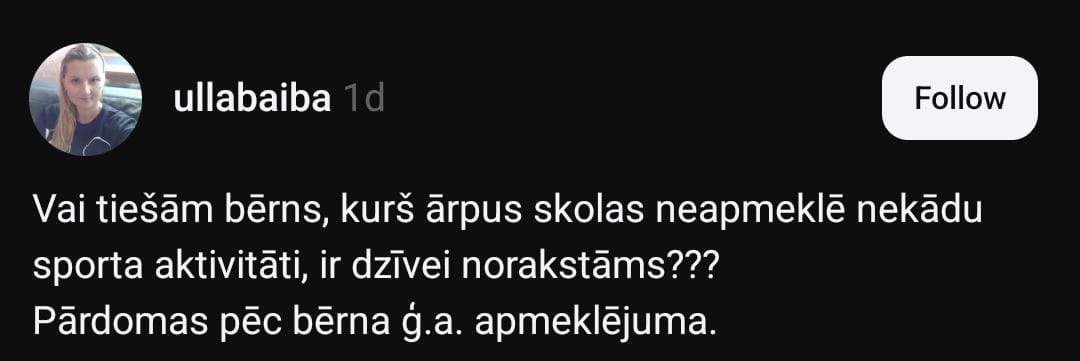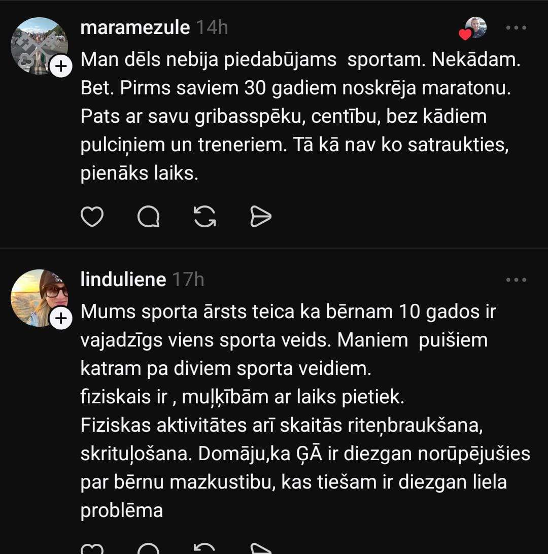 Baiba sociālo mediju platformā “Threads” jautā: “Vai tiešām bērns, kurš ārpus skolas neapmeklē nekādu sporta aktivitāti, ir dzīvei norakstāms?”