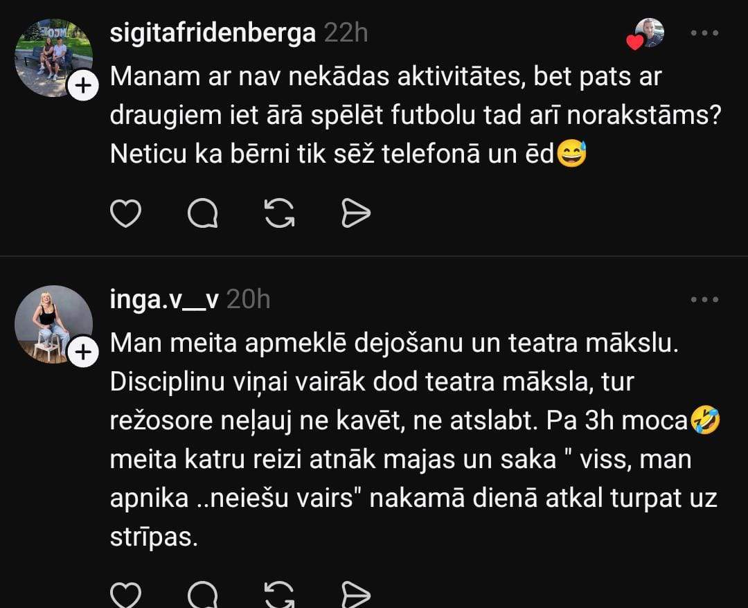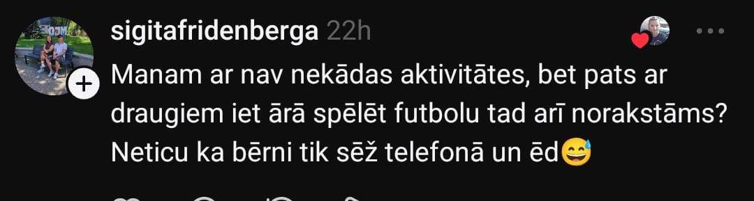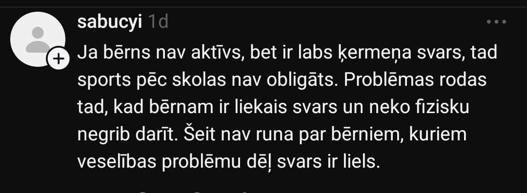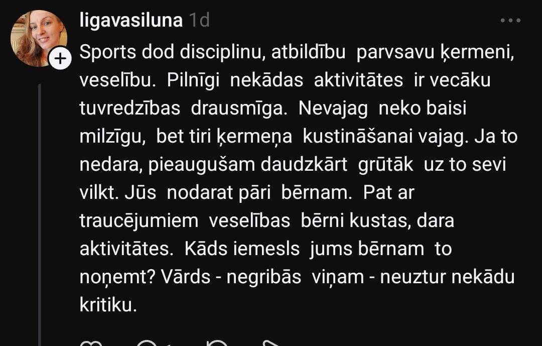 Monta komentāru sadaļā norāda, ka tā nav patiesība: “Ne visiem bērniem patīk komandu sports un individuālos sportos piedāvājums liekas šaurs. Ja bērnam patīk dziedāt, tad lai dzied. Manuprāt, absurdi gaidīt, ka visiem patiks futbols utt. Varbūt dejas sporta vietā ir pat labāk? Pastaigas, pārgājieni ar ģimeni arī ir kustība. Ģimenes ārstiem bieži pērles visādas.”