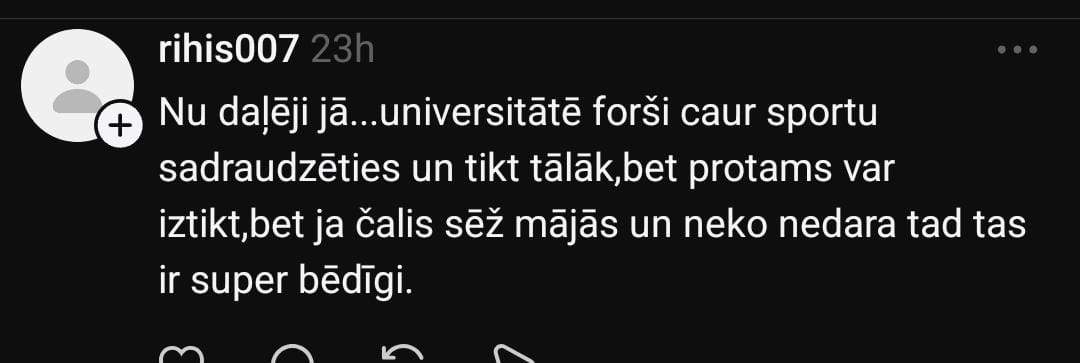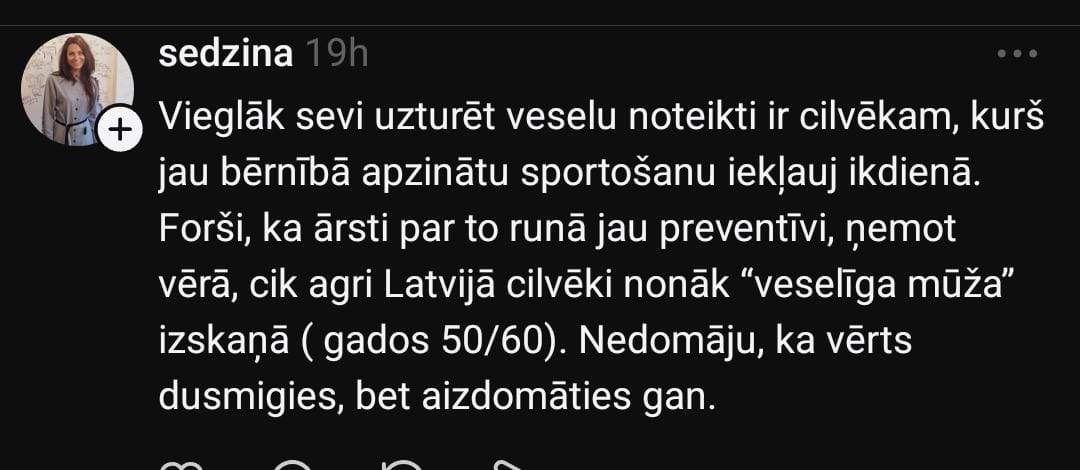 Sindija dalās savā pieredzē, ka jaunībā arī nav apmeklējusi sporta treniņus, bet ir izaugusi, nav nodzērusies, strādā apmierinošā amatā.