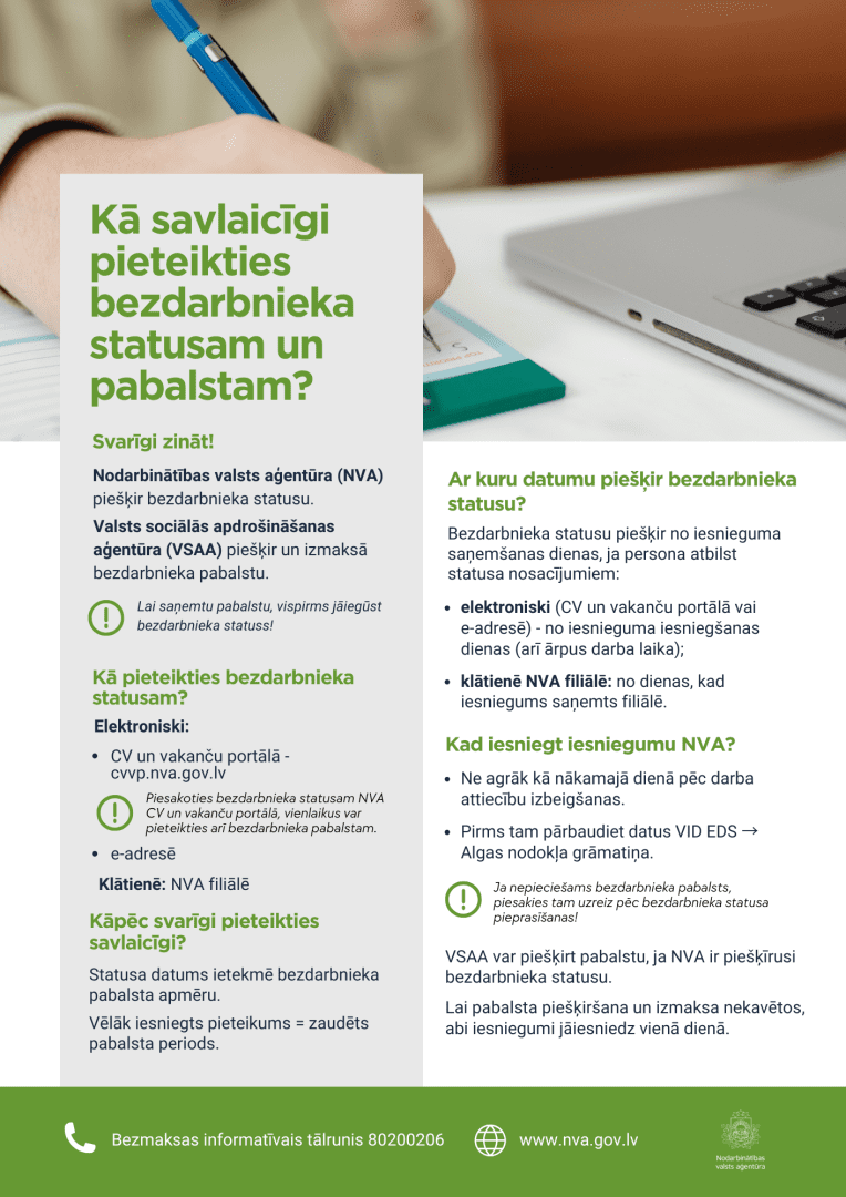 NVA aicina iedzīvotājus rūpīgi iepazīties ar informāciju par bezdarbnieka statusa iegūšanu un pabalsta piešķiršanas nosacījumiem un neatlikt pieteikšanos bezdarbnieka statusam, ja tas ir nepieciešams, jo tas var ietekmēt sociālo atbalstu.
