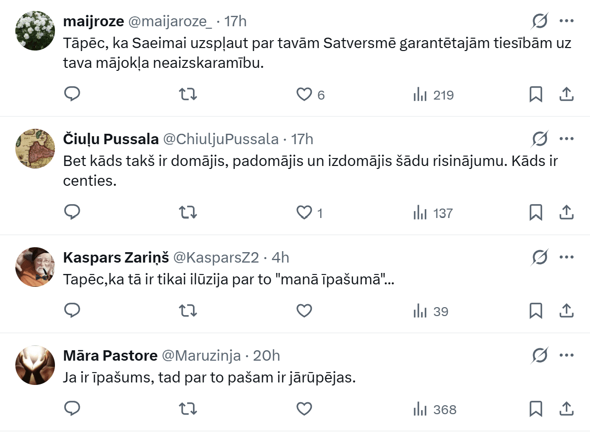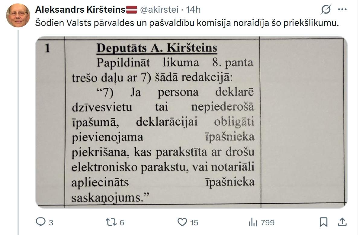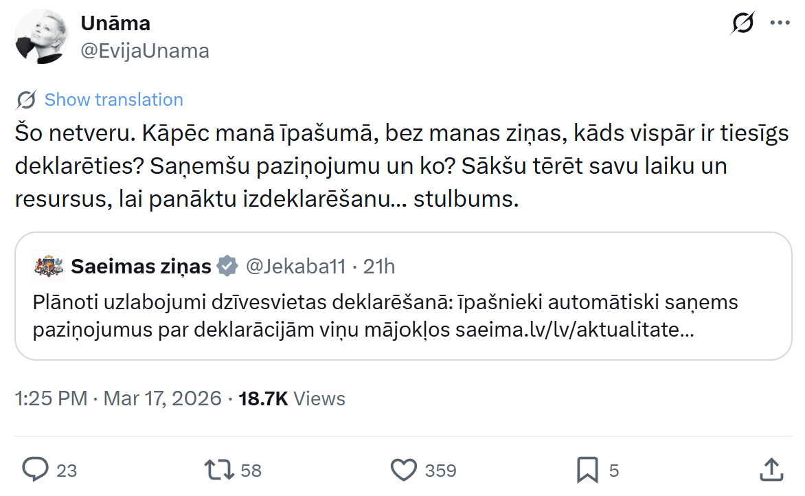 Saeimas Valsts pārvaldes un pašvaldību lietu komisija otrdien, 17.martā, trešajā lasījumā atbalstīja grozījumus Dzīvesvietas deklarēšanas likumā, kas nostiprinās īpašnieku tiesības savlaicīgi saņemt informāciju par personām, kuras deklarējušas dzīvesvietu viņu īpašumā bez tiesiska pamata. Tikmēr sociālajos tīklos cilvēki ne tikai pauž neizpratni, bet arī atklātu sašutumu par to, ka viņu īpašumos kāds var deklarēties bez viņu ziņas. “Kā tas vispār līdz šim bijis iespējams?” viņi vaicā.