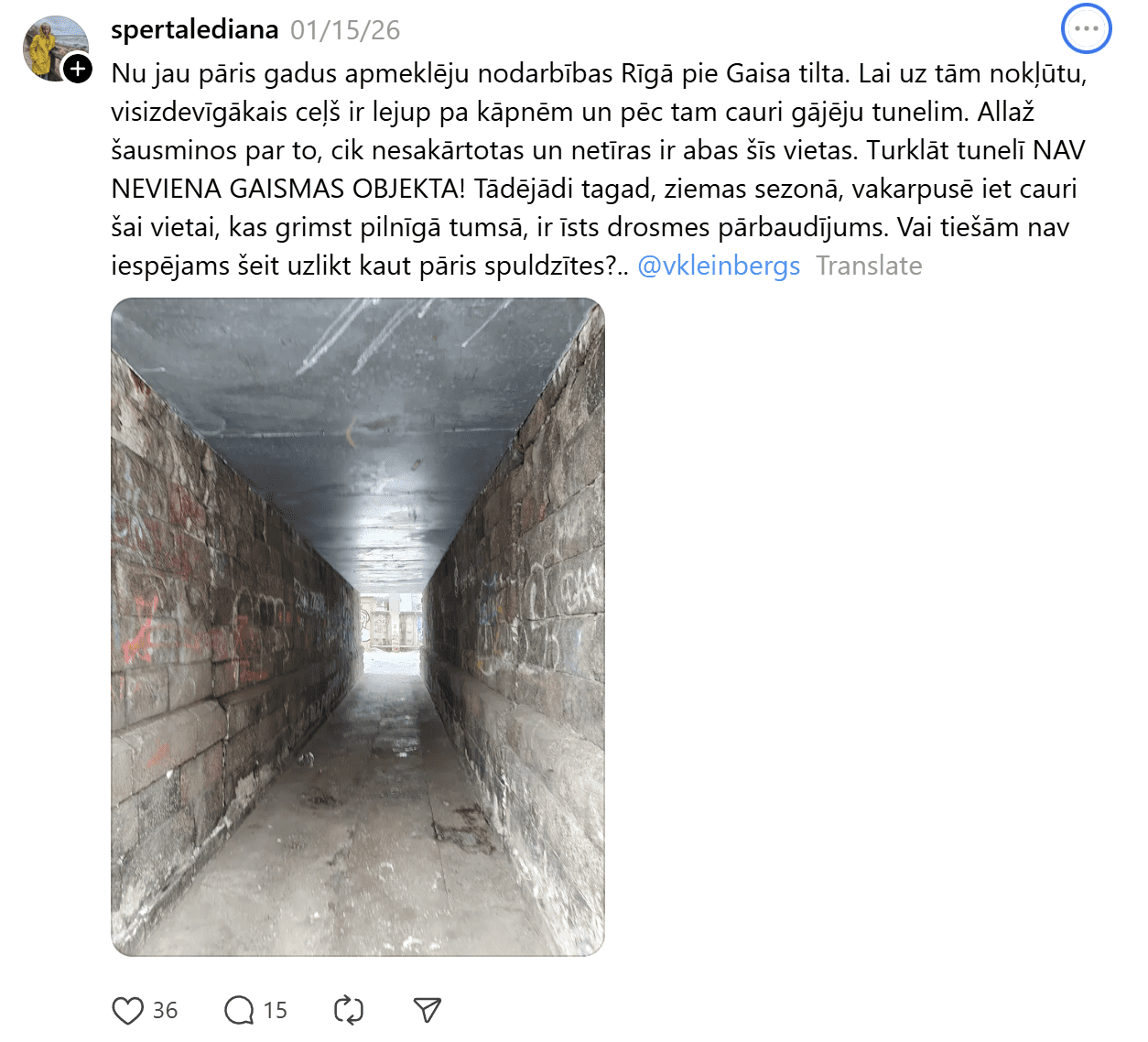 “Nu jau pāris gadus apmeklēju nodarbības Rīgā pie Gaisa tilta. Lai uz tām nokļūtu, visizdevīgākais ceļš ir lejup pa kāpnēm un pēc tam cauri gājēju tunelim. Allaž šausminos par to, cik nesakārtotas un netīras ir abas šīs vietas. Turklāt tunelī NAV NEVIENA GAISMAS OBJEKTA! Tādējādi tagad, ziemas sezonā, vakarpusē iet cauri vietai, kas grimst pilnīgā tumsā, ir īsts drosmes pārbaudījums. Vai tiešām nav iespējams uzlikt kaut pāris spuldzītes,” vaicā sieviete.