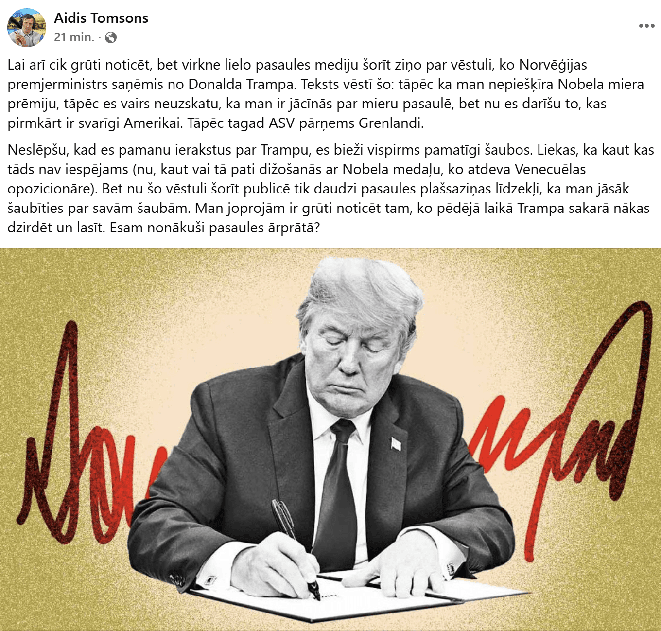 “Vairs nejūtu pienākumu domāt tikai par mieru” – Tramps ar vēstuli Norvēģijas premjeram pielej eļļu ugunij 0