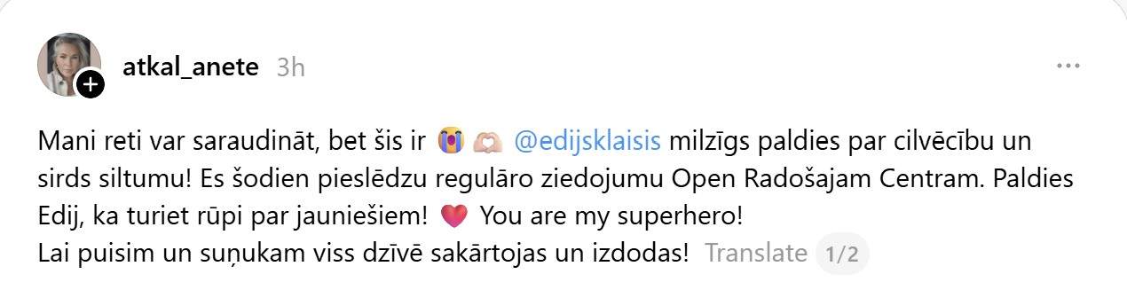 Piemēram, Anete soctīklā “Threads”, daloties ar šo ziņu, neslēpj, ka šis stāsts pamudinājis arī viņu paveikt ko labu: “Mani reti var saraudināt, bet šis ir 😭🫶🏻. Edij, milzīgs paldies par cilvēcību un sirds siltumu! Es šodien pieslēdzu regulāro ziedojumu Open Radošajam Centram. Paldies Edij, ka turiet rūpi par jauniešiem! You are my superhero! Lai puisim un suņukam viss dzīvē sakārtojas un izdodas!”