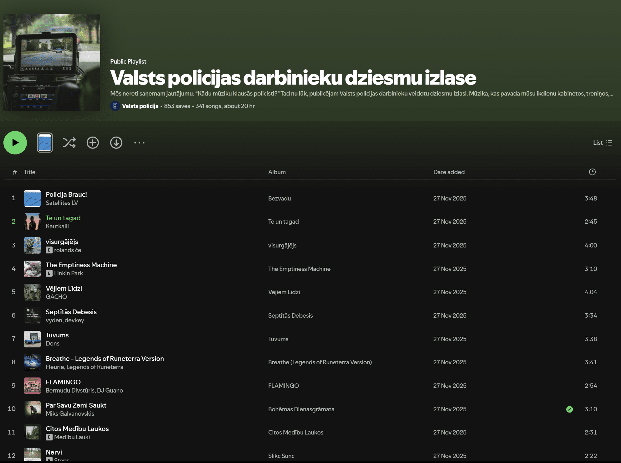Kā tu domā – ko klausās policisti, dodoties ikdienas izsaukumos? Nu vairs nav jāmin – Valsts policija ir publiskojusi savu oficiālo “Spotify” dziesmu izlasi, un tajā ir no visa pa bišķiņam.
