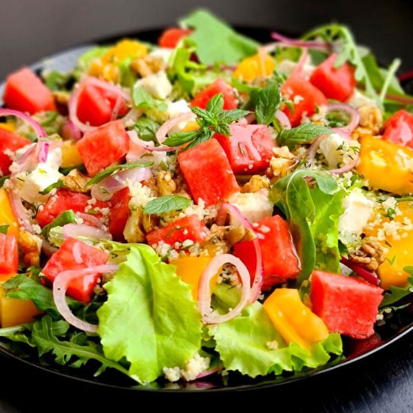 Vasaras garšas recepte bļodiņā: arbūza, gurķa un fetas salāti ar piparmētru un baziliku 0
