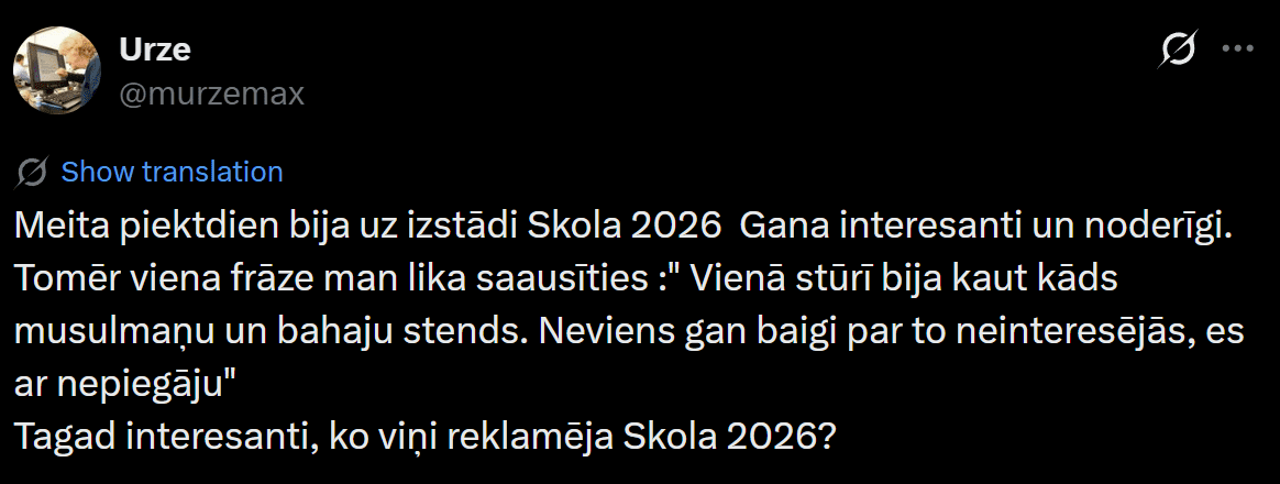 “Meita piektdien bija uz izstādi “Skola 2026”. Gana interesanti un noderīgi. Tomēr viena frāze man lika saausīties: “Vienā stūrī bija kaut kāds musulmaņu un bahāju stends. Neviens gan baigi par to neinteresējās, es arī nepiegāju.” Tagad interesanti, ko viņi reklamēja “Skola 2026?”” soctīklā “X” dalās persona ar segvārdu Urze.