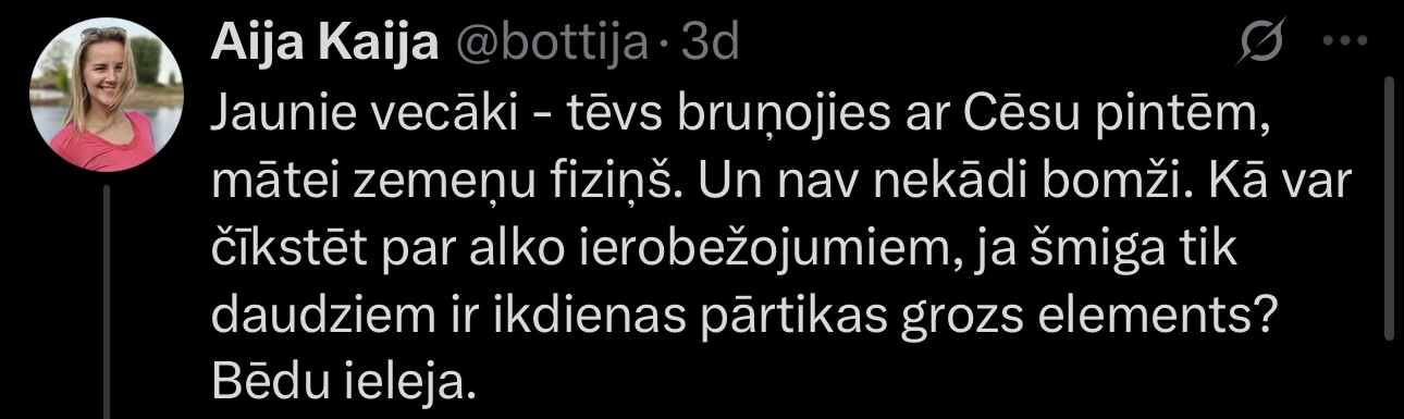 Aija dalās ar pieredzēto platformā “X”: “Jaunie vecāki — tēvs bruņojies ar Cēsu pintēm, mātei zemeņu fiziņš. Un nav nekādi bomži. Kā var čīkstēt par alko ierobežojumiem, ja šmiga tik daudziem ir ikdienas pārtikas groza elements? Bēdu ieleja.”
